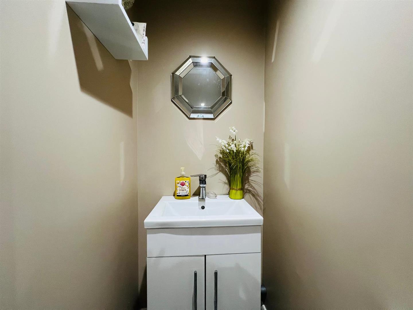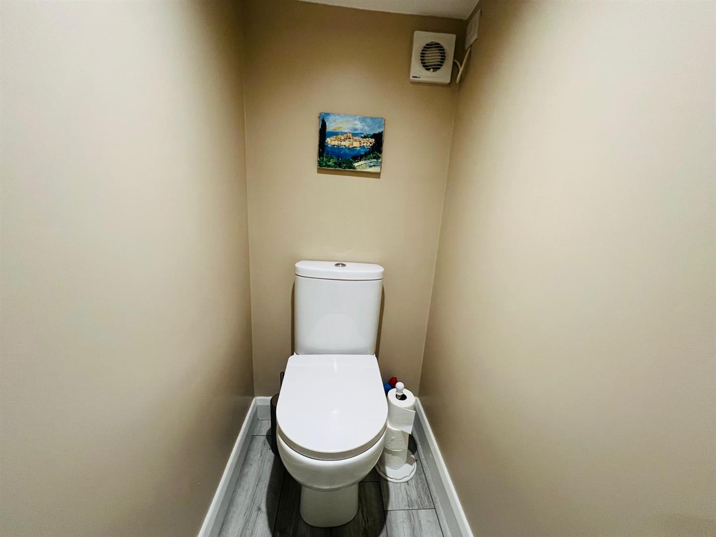 Having whb set in vanity unit, wc, extractor fan, recessed lighting, laminated wooden floor.