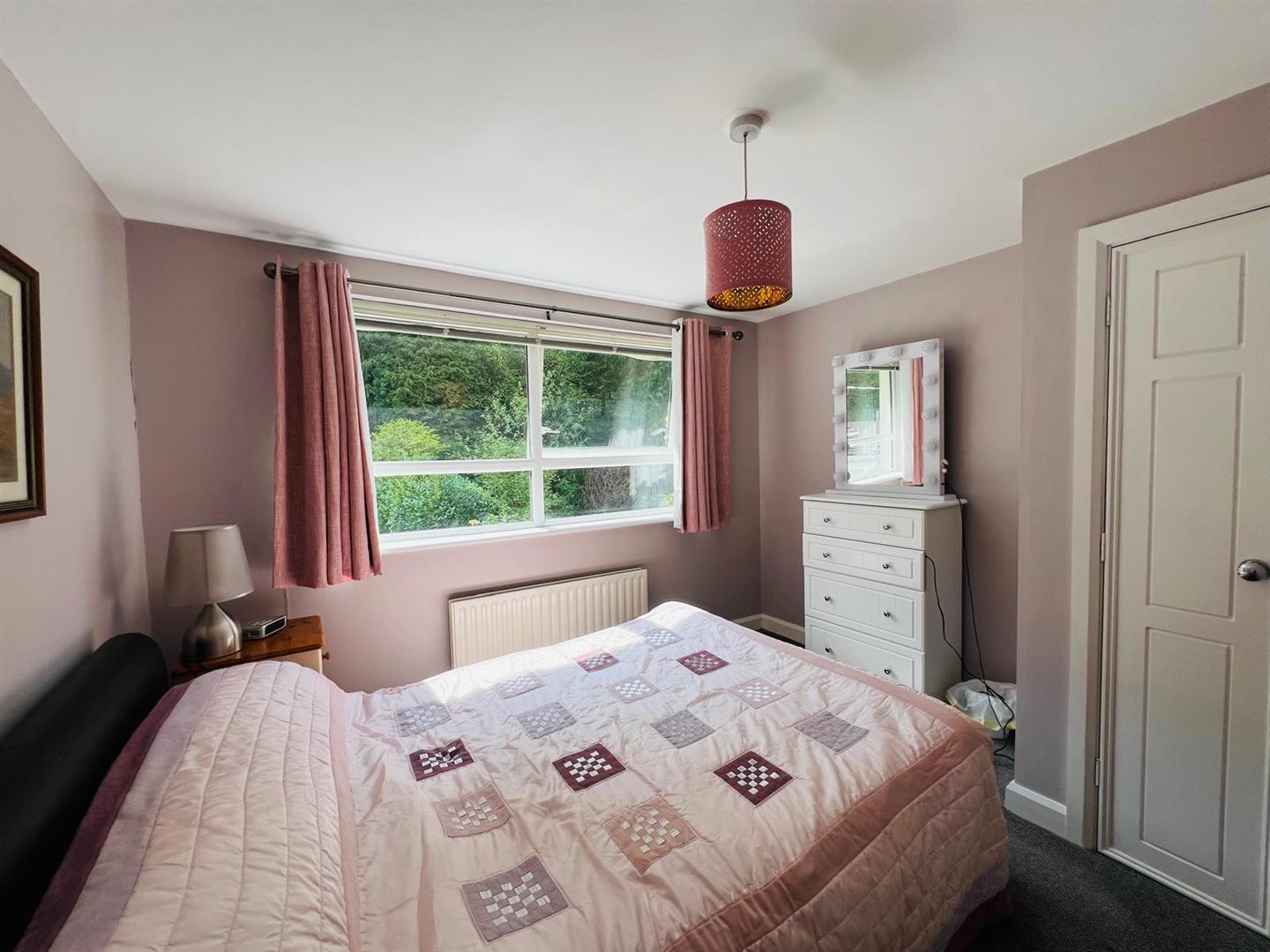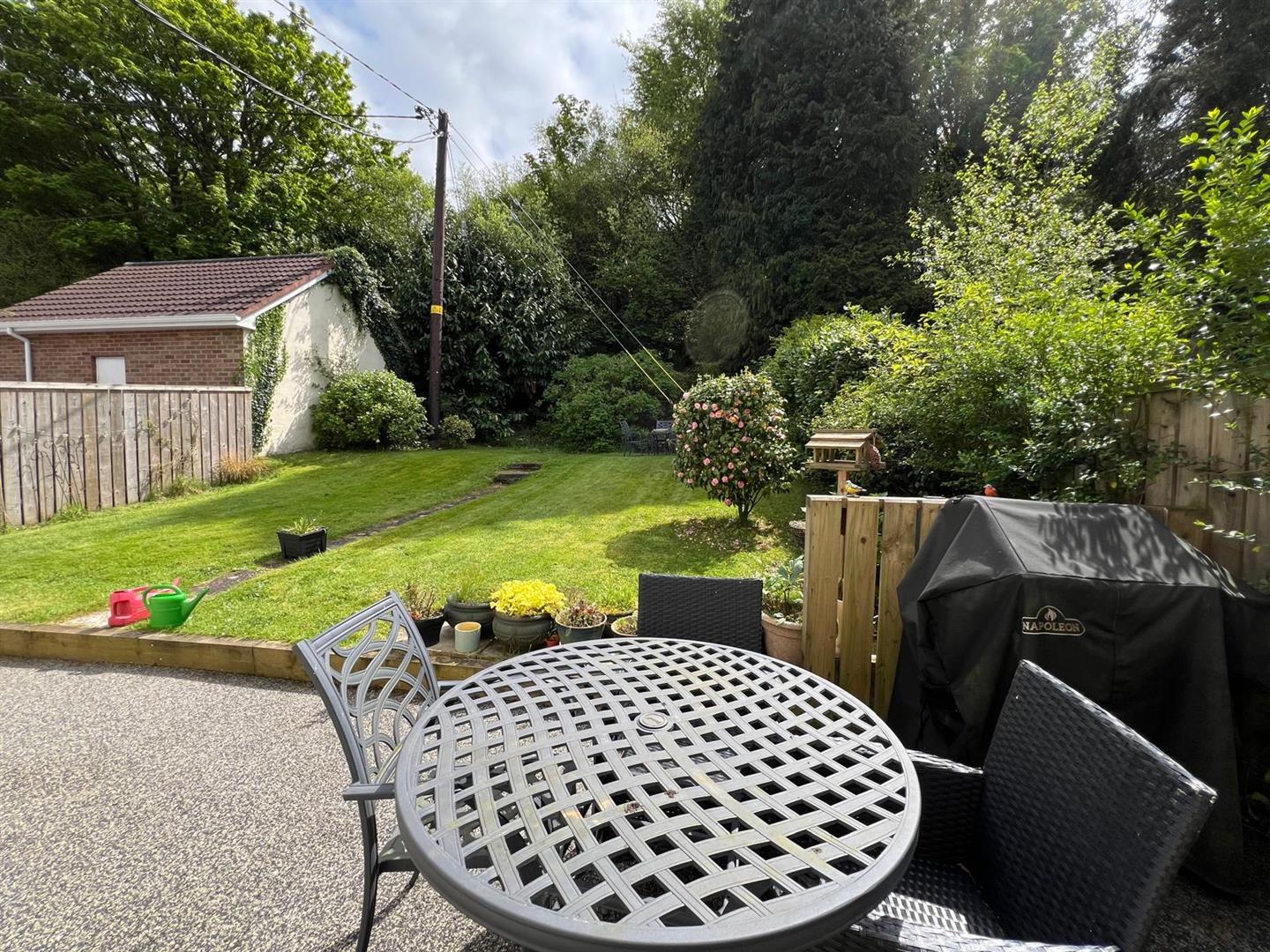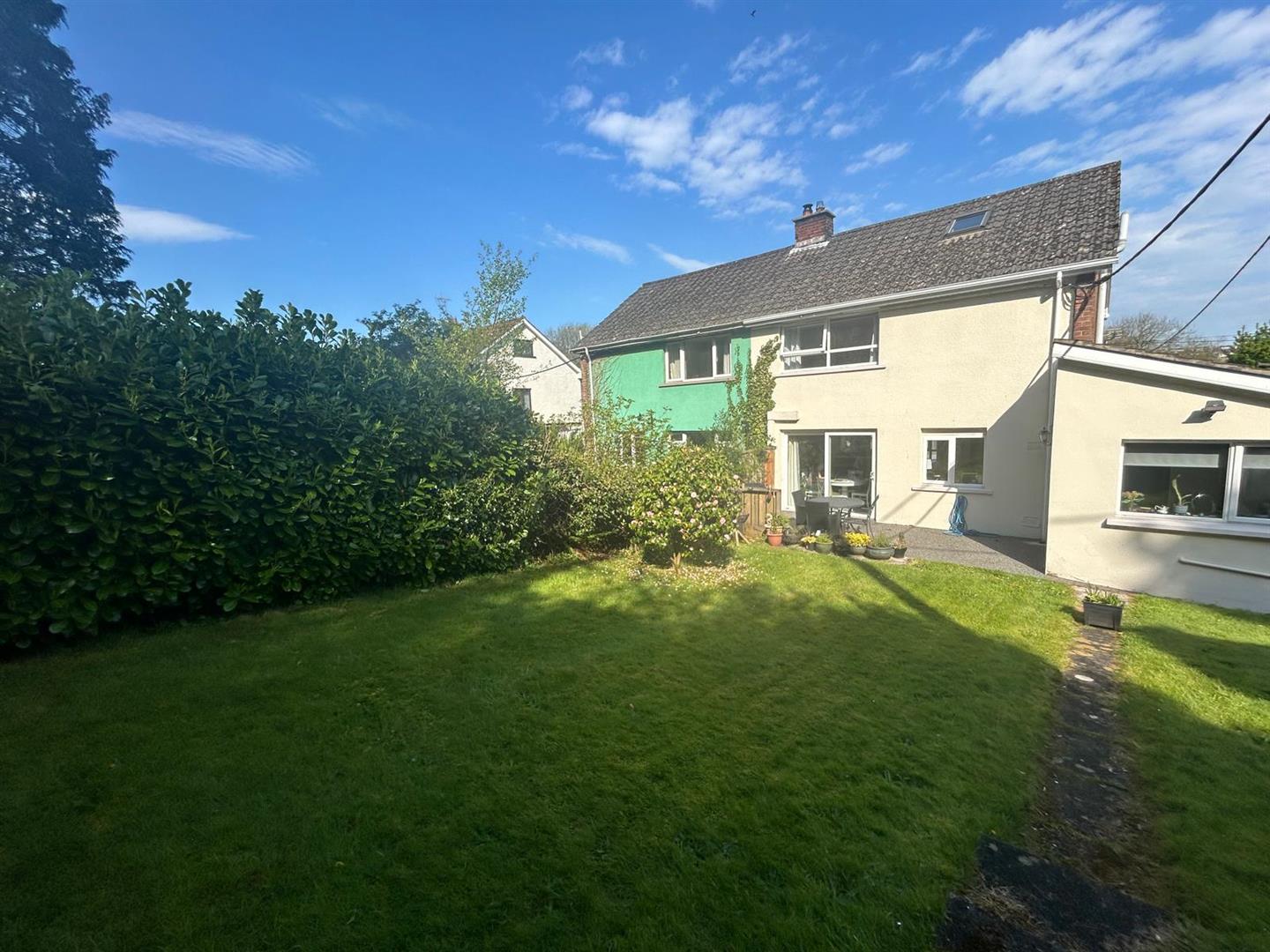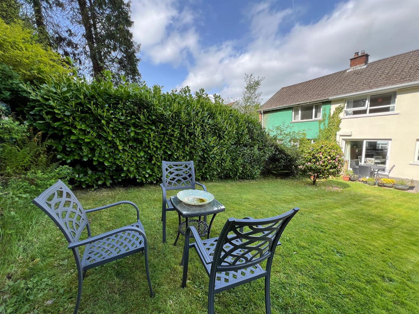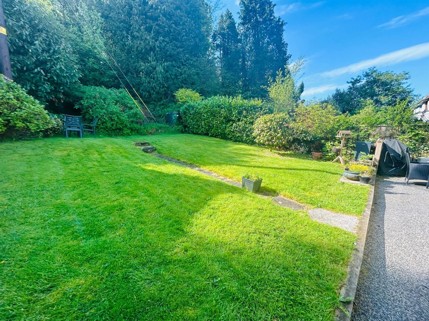 Neat lawn to rear bordered by marure shurbs and trees.