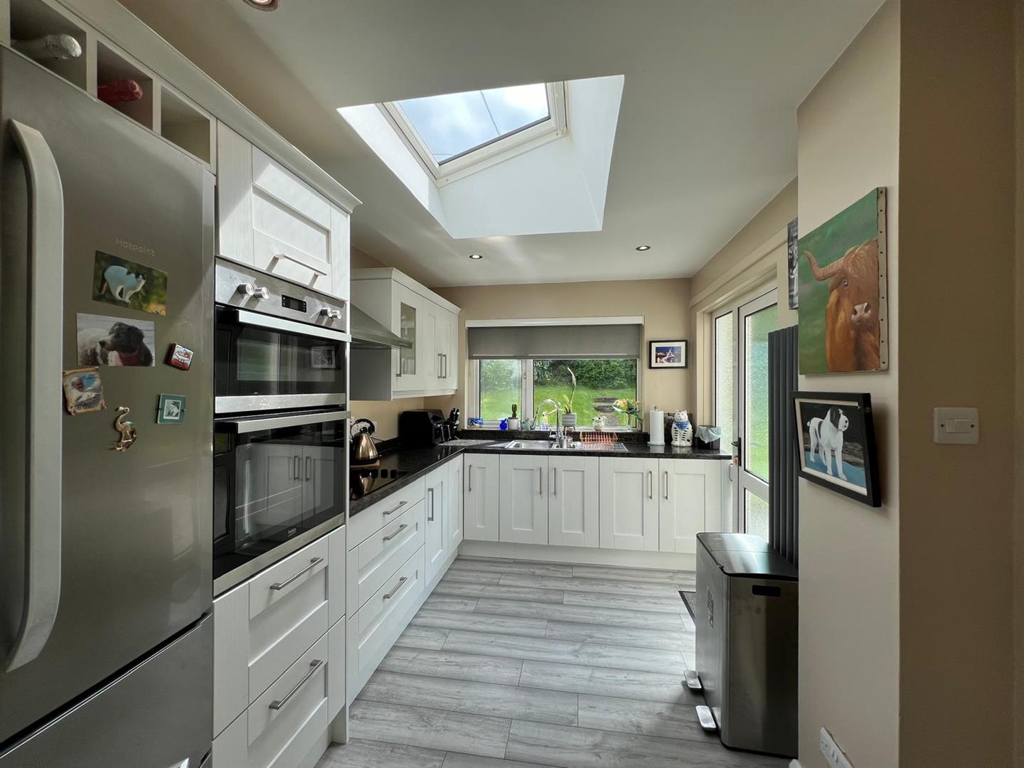 3.73m x 2.69m (12'3" x 8'10") - Having eye and low level units with concealed lighting under, glazed dsiplay cupboards, 1 1/2 bowl single drainer stainless steel sink unit with mixer taps, hob, 'Beko' double oven, stainless steel extractor hood, space for fridge/freezer, recessed lighting, laminate floor.