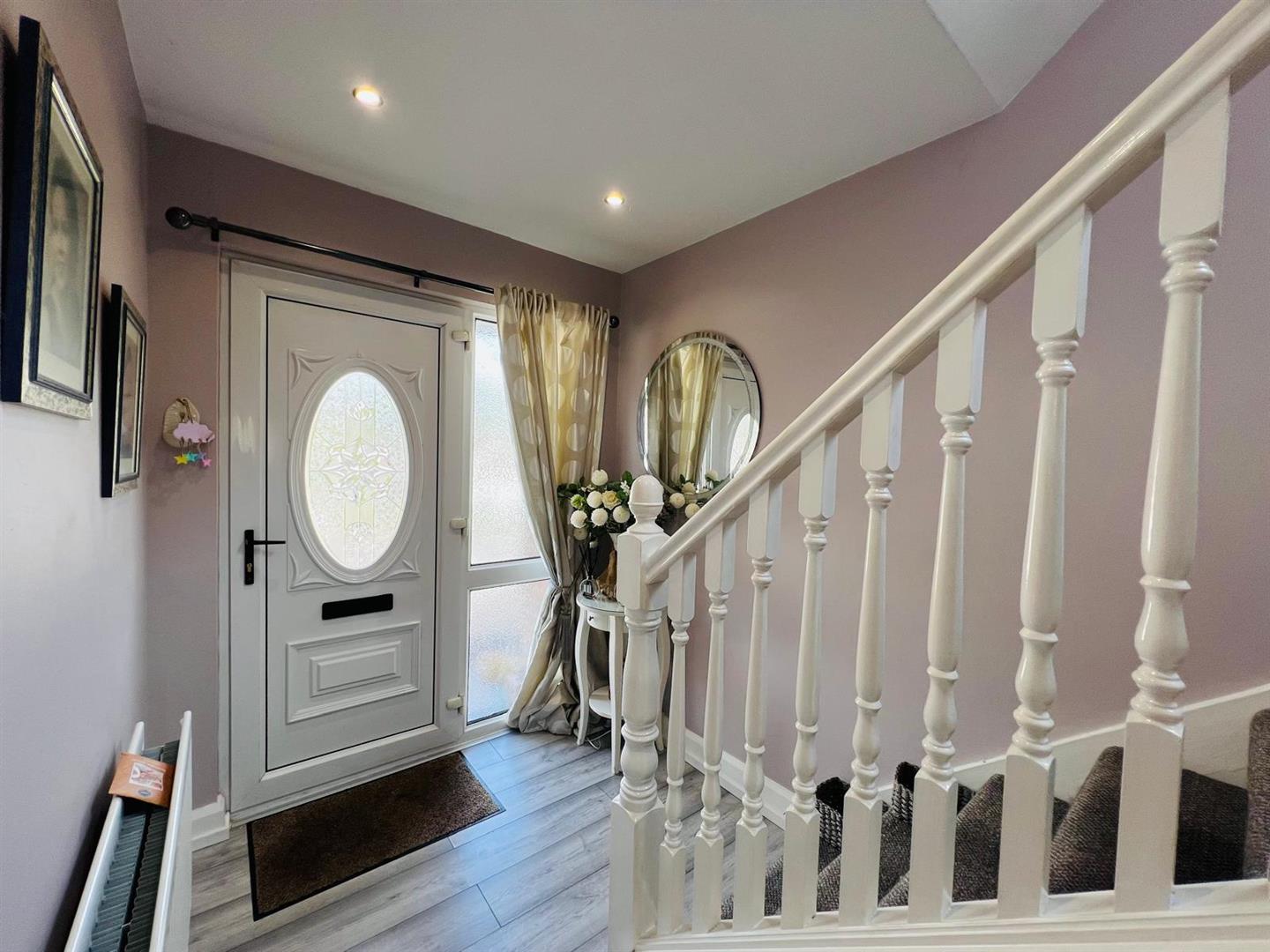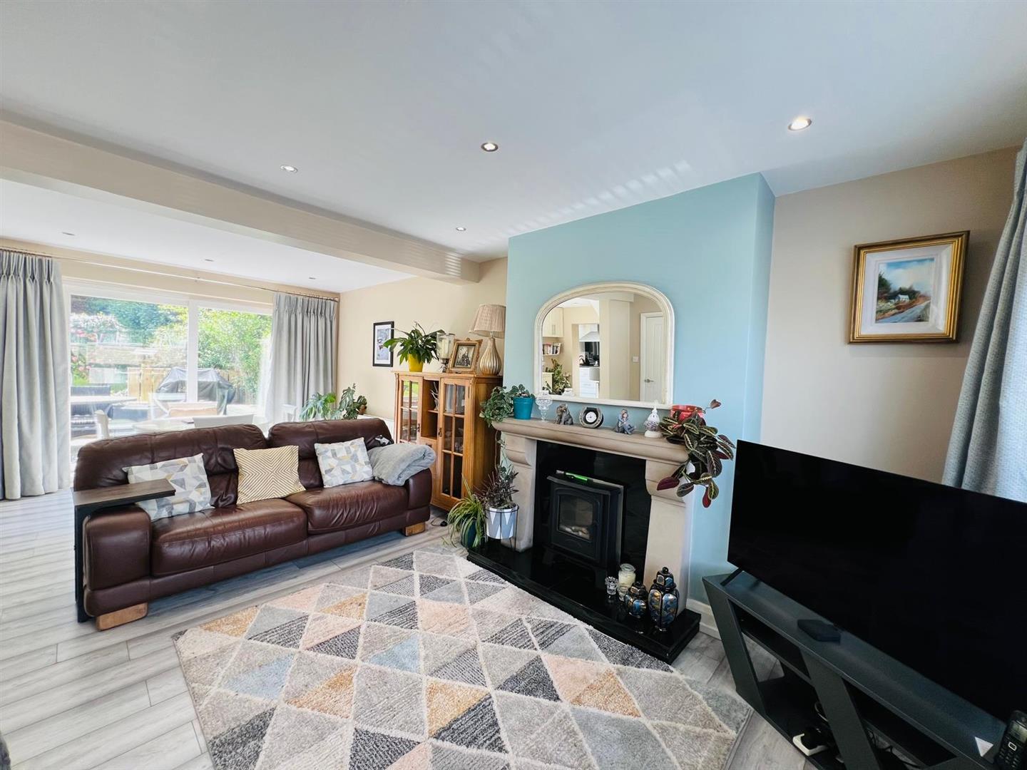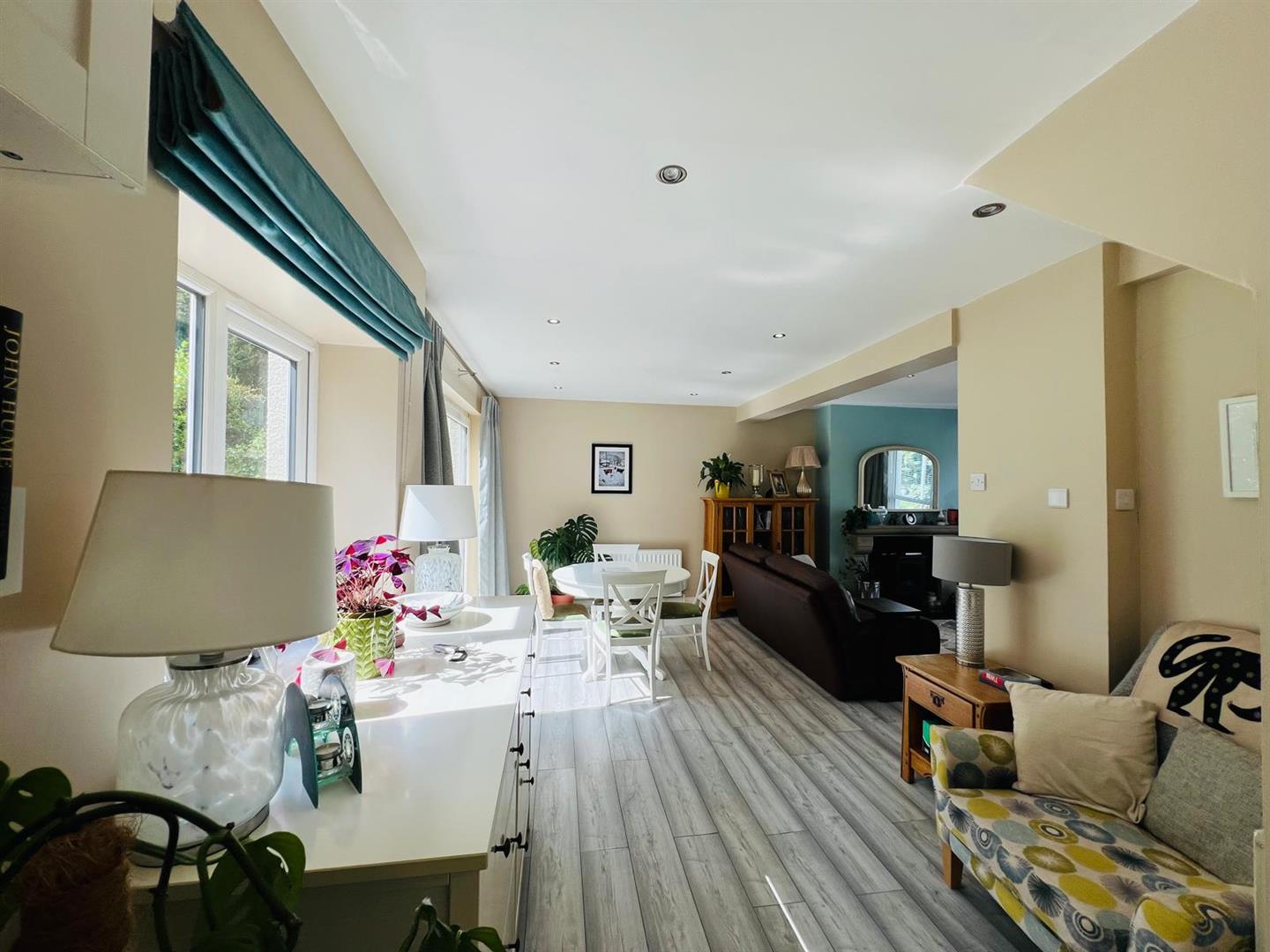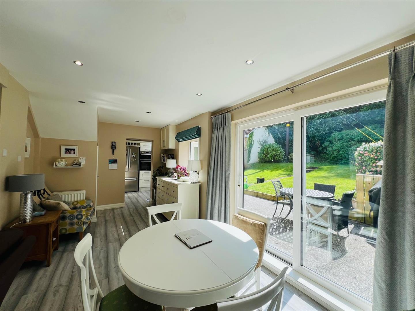 6.83m x 6.07m wp (22'5" x 19'11" wp) - Having attractive fireplace, understairs storage cupboard, recessed lighting, laminated wooden floor, ample dining space with patio doors.