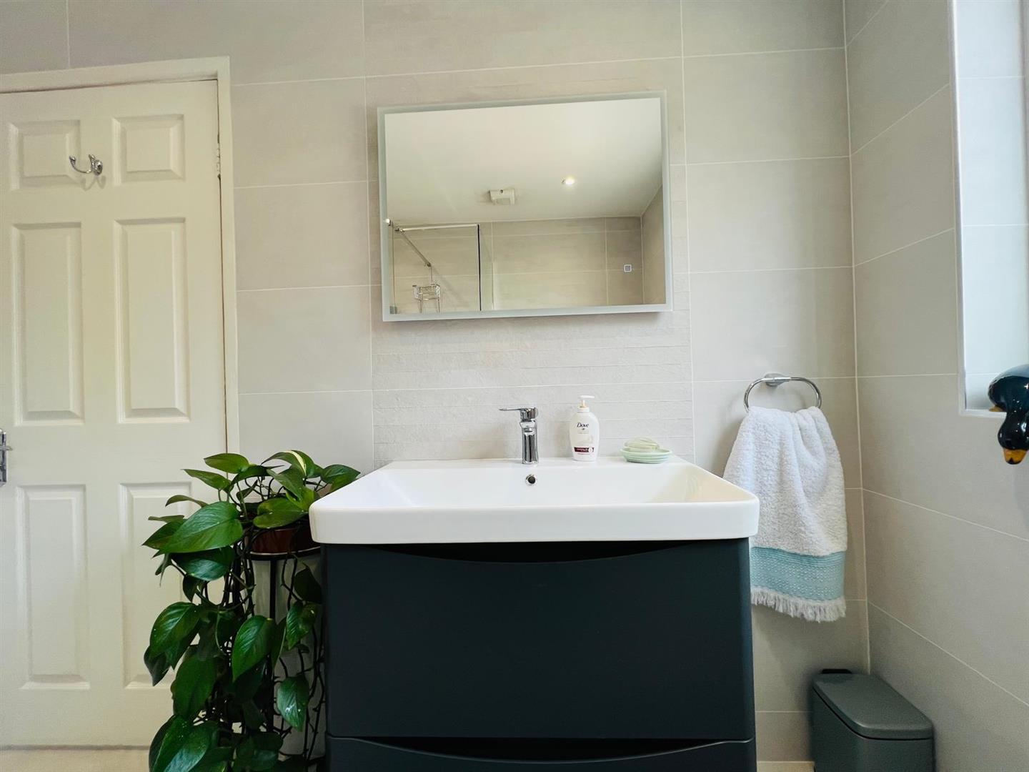 Comprising fully tiled walk in electric shower, whb set in vanity unit, wc, recessed lighting, feature radiator, fully tiled walls, tiled floor.