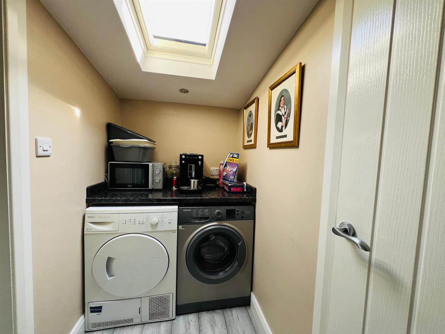 Plumbed for washing machine, space for tumble dryer, recessed lighting, tiled floor.