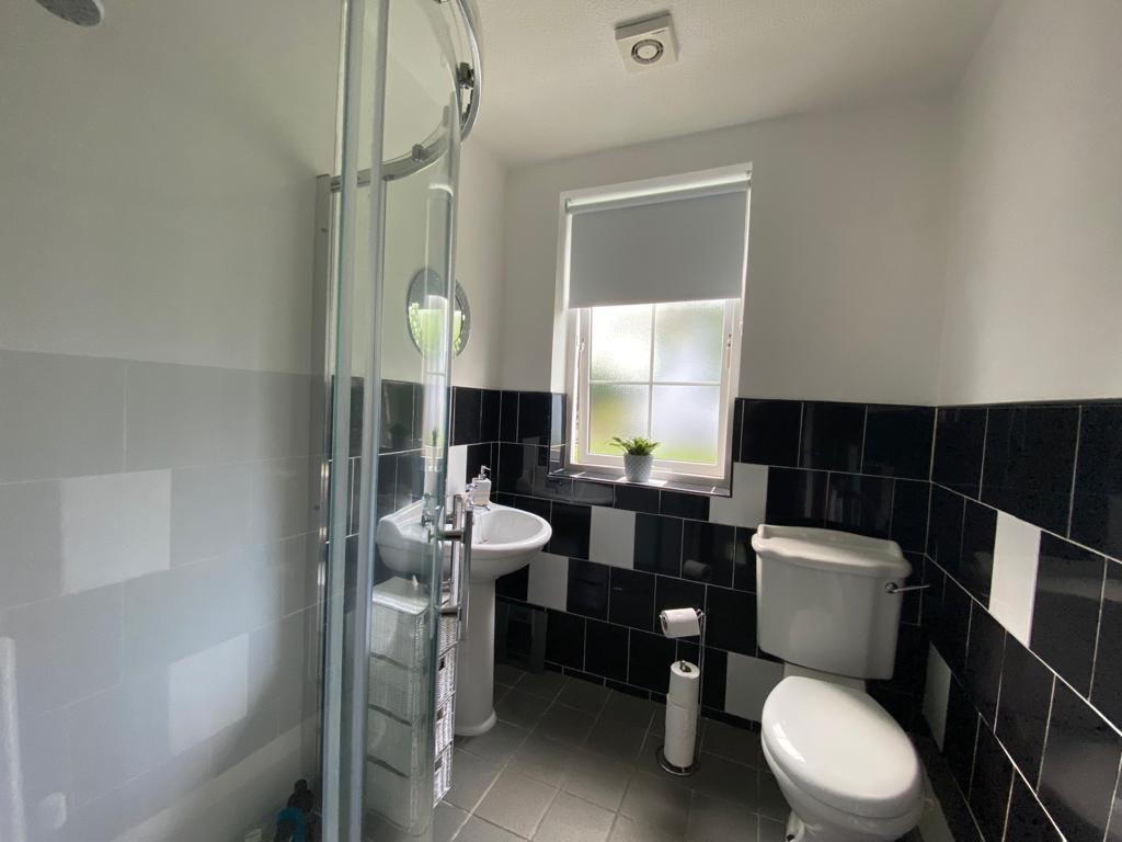 Comprising walk in shower with PVC cladding to walls, whb and wc, 1/2 tiled walls, tiled floor.