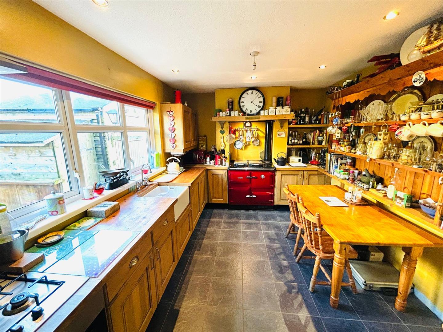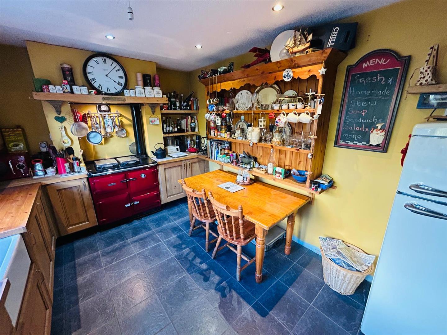 3.96m x 2.97m (13' x 9'9") - Having eye and low level units, Belfast sink unit with mixer taps, gas hob, electric underoven, space for fridge / freezer, plumbed for Rayburn cooker, tiled floor.