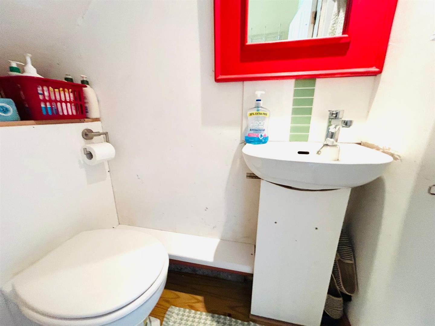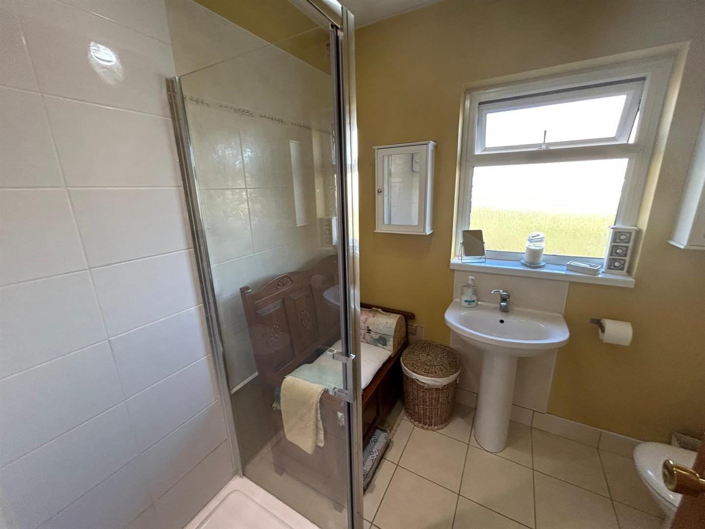 Comprising fully tiled walk in electric shower, whb with mixer taps and tiling around, wc, hotpress, tiled floor.