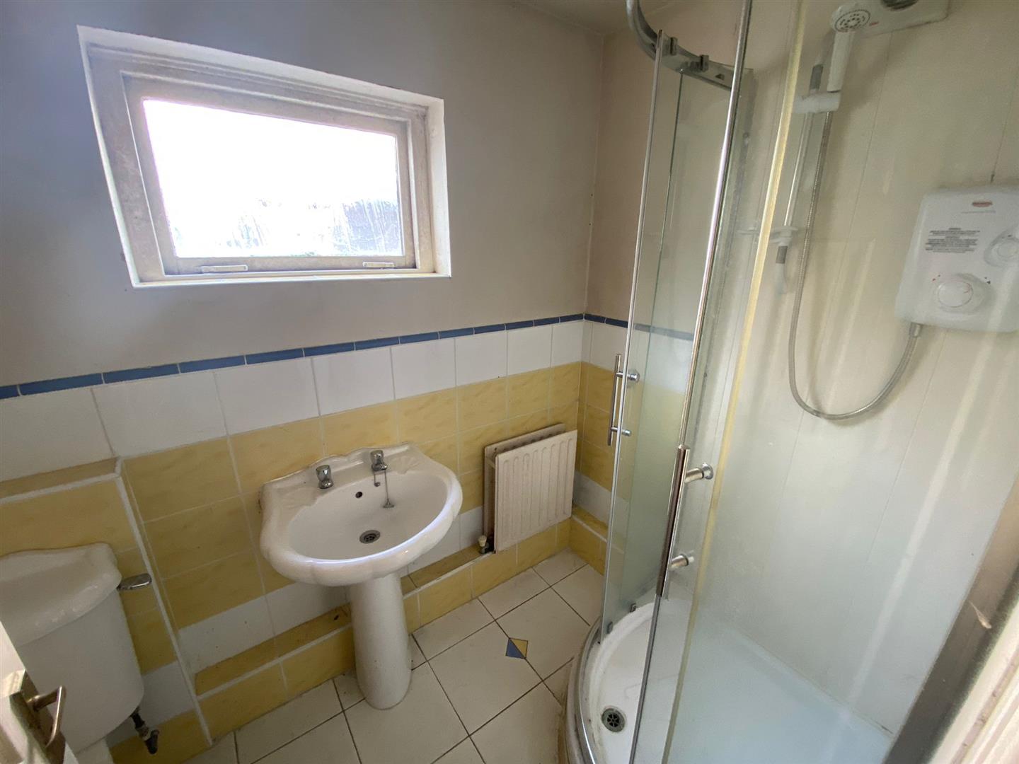 Comprising walk in electric shower with PVC cladding to walls, whb and wc, partly tiled walls, tiled floor.
