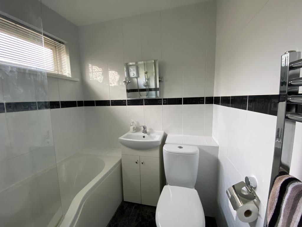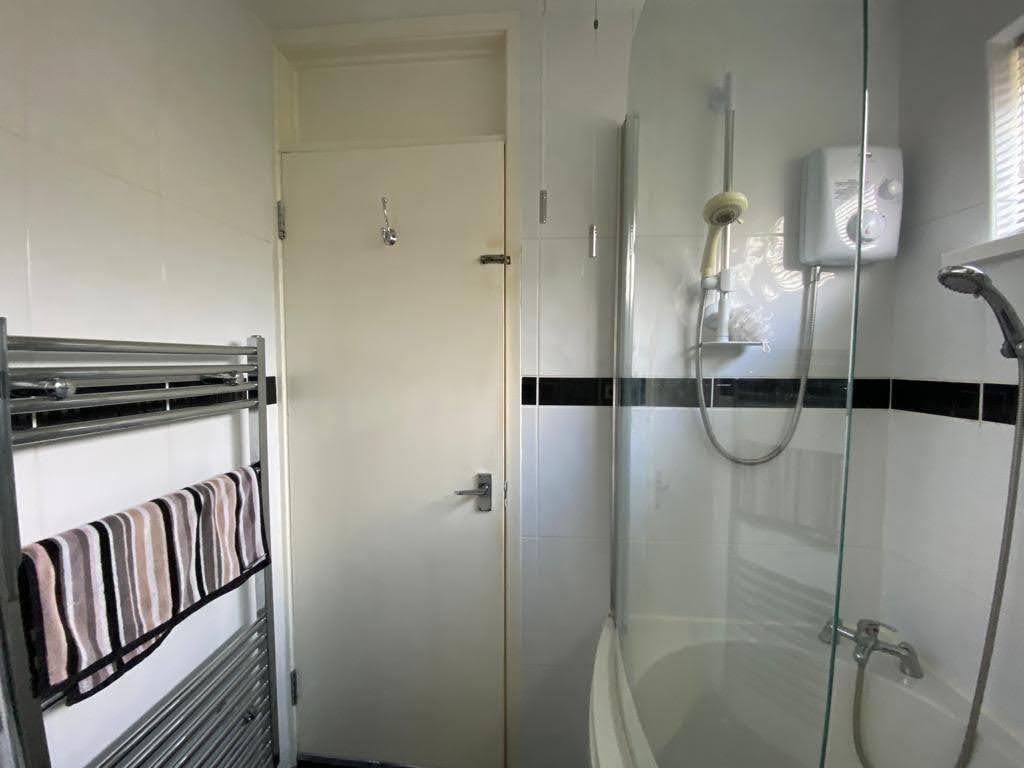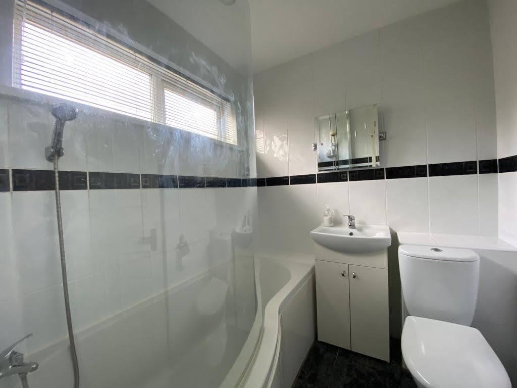 Comprising bath with electric shower over, shower screen, whb set in vanity unit, wc, tiled walls and floor.
