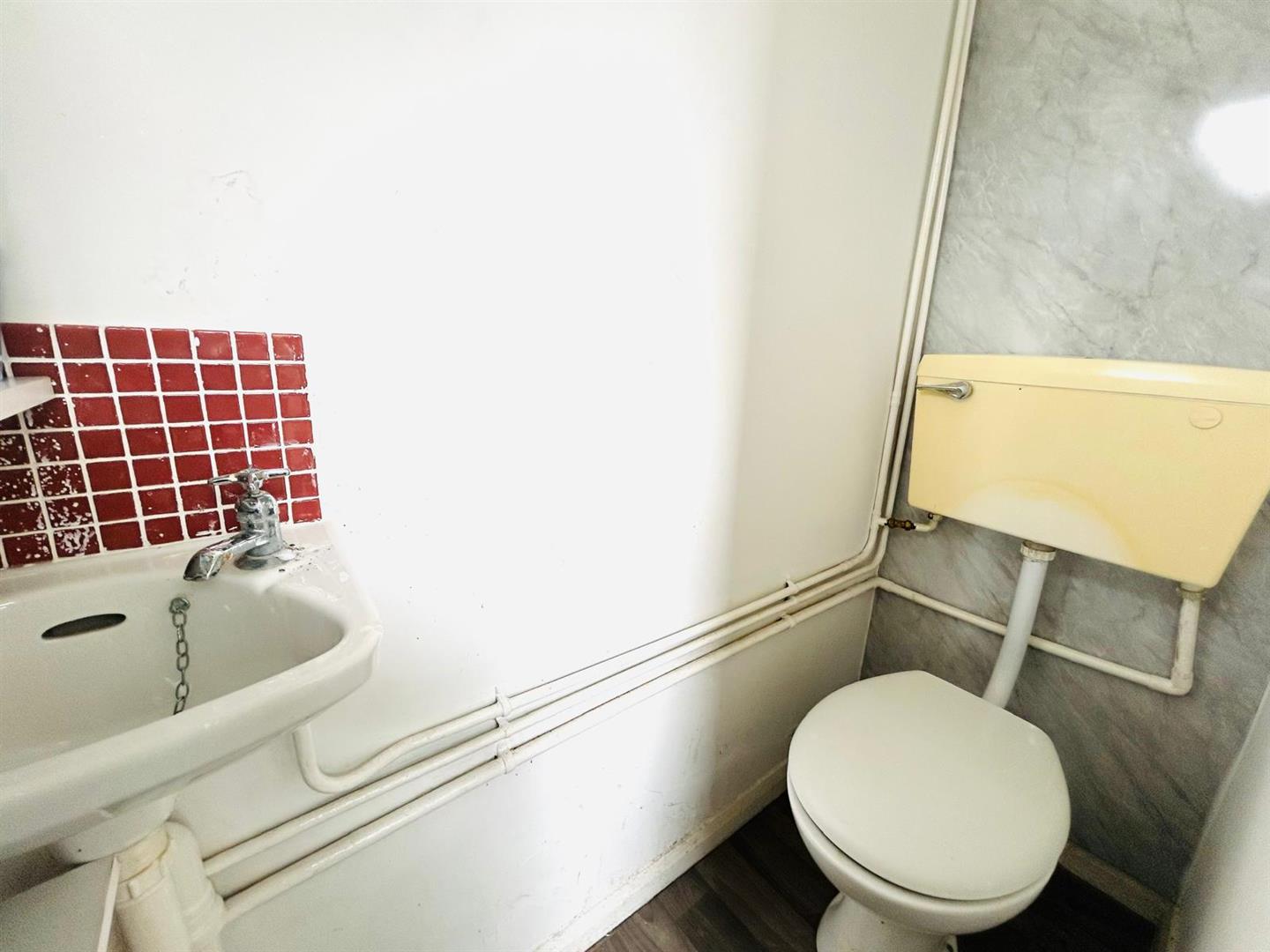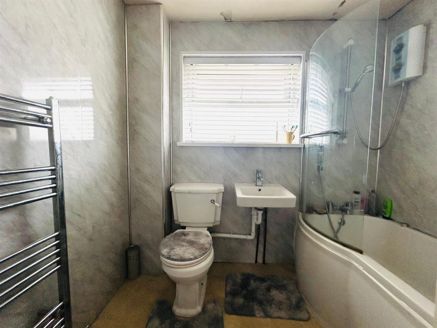 Comprising bath with shower attachment to taps and electric shower over, whb with mixer taps, wc, PVC cladding to walls.