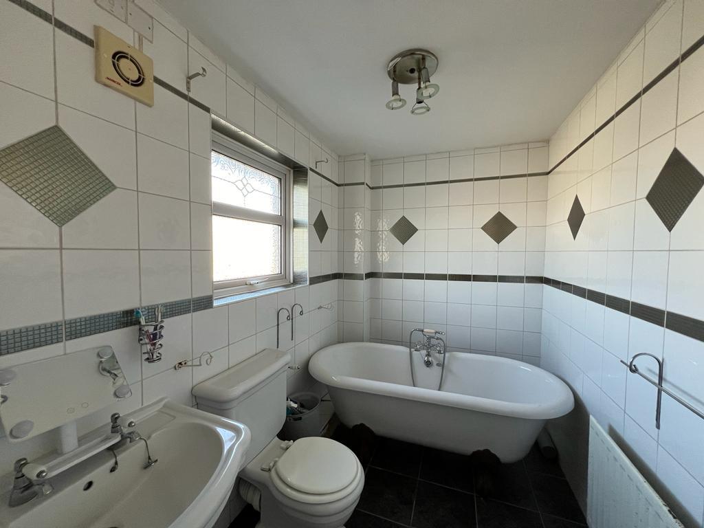 Comprising bath with shower fitting to taps, whb and wc, fully tiled walls and floor.
