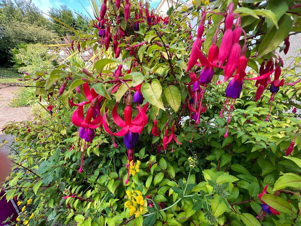 Lawn to rear with mature plants, trees & shrubs and pond.