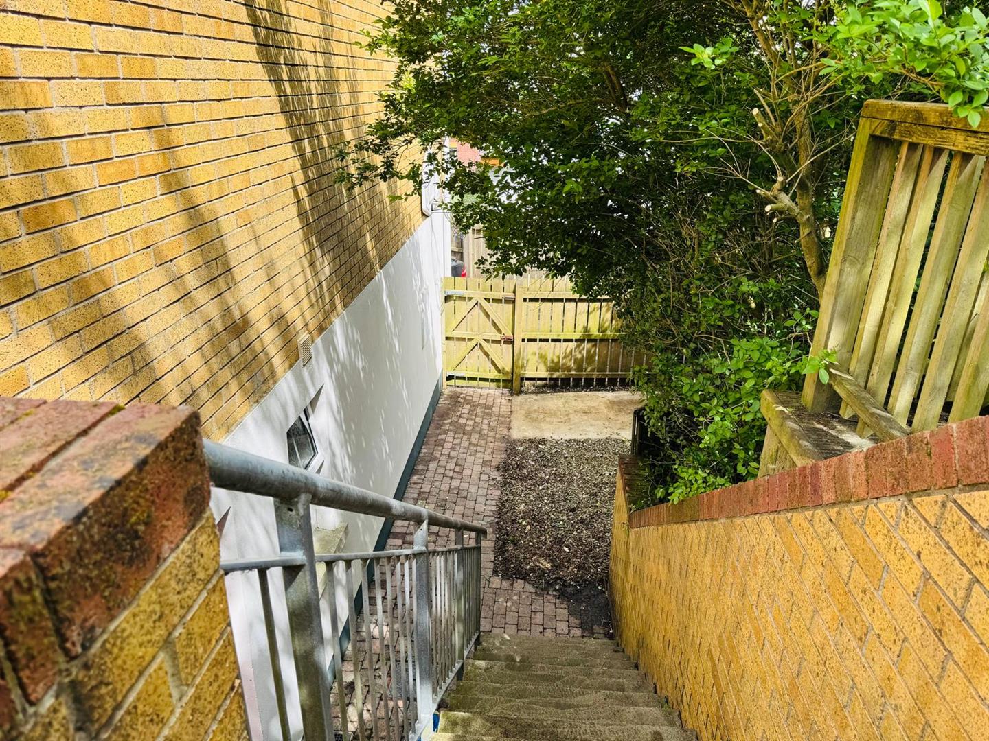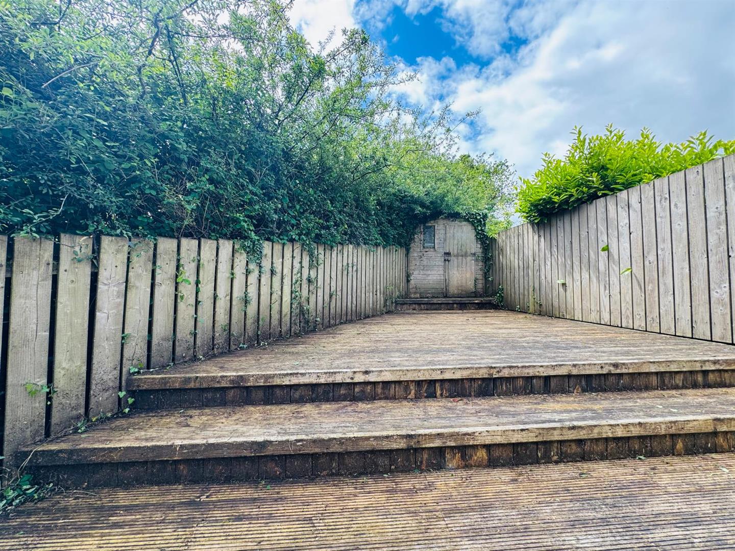 Enclosed yard to side with store. Steps to rear lawn.