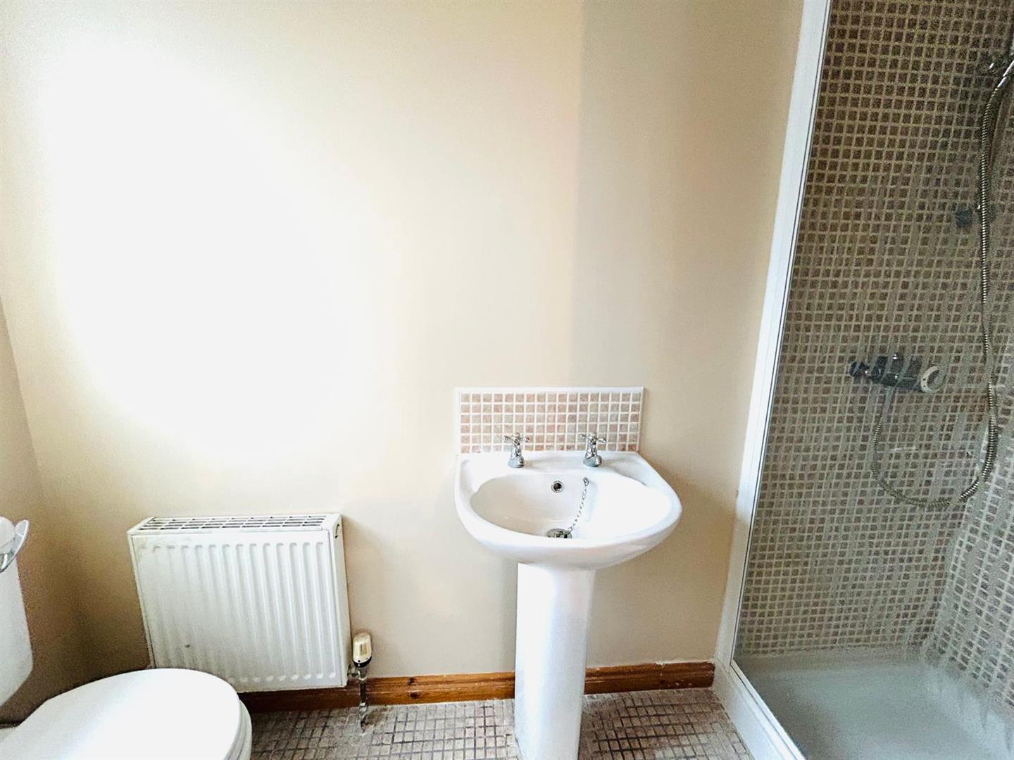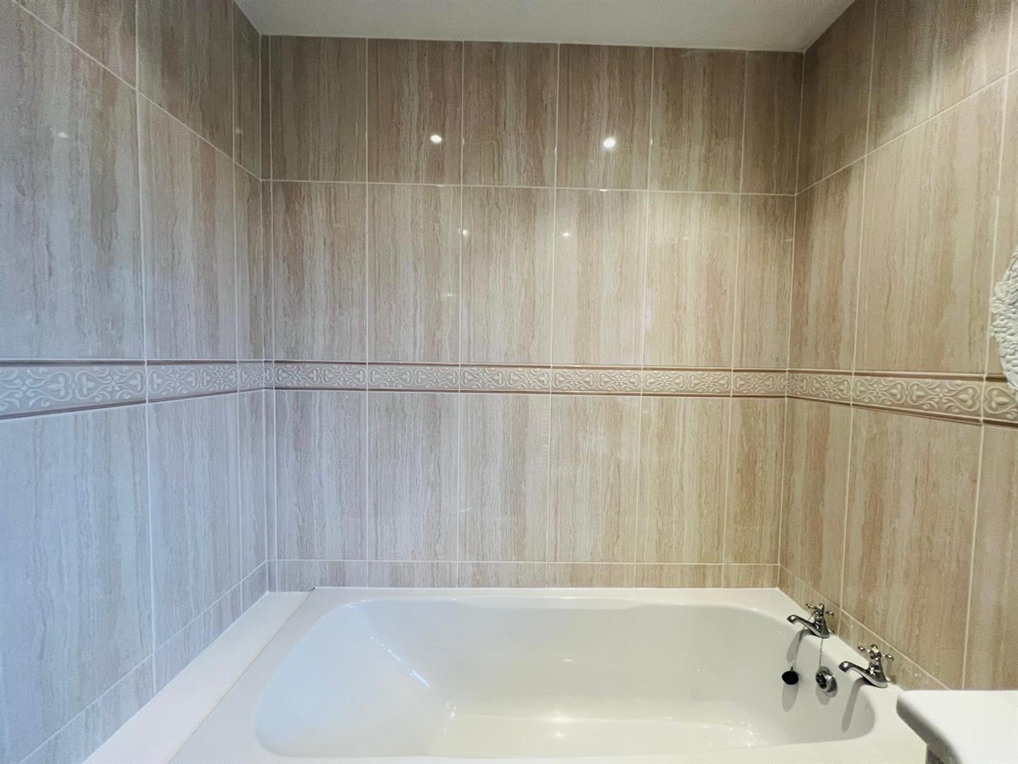 Comprising bath, fully tiled walk in electric shower, whb set in vanity unit, wc, chrome radiator, fully tiled walls and floor.