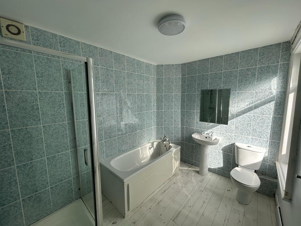 Comprising bath with shower attachment to taps, whb and wc, extrator fan, partly tiled walls.