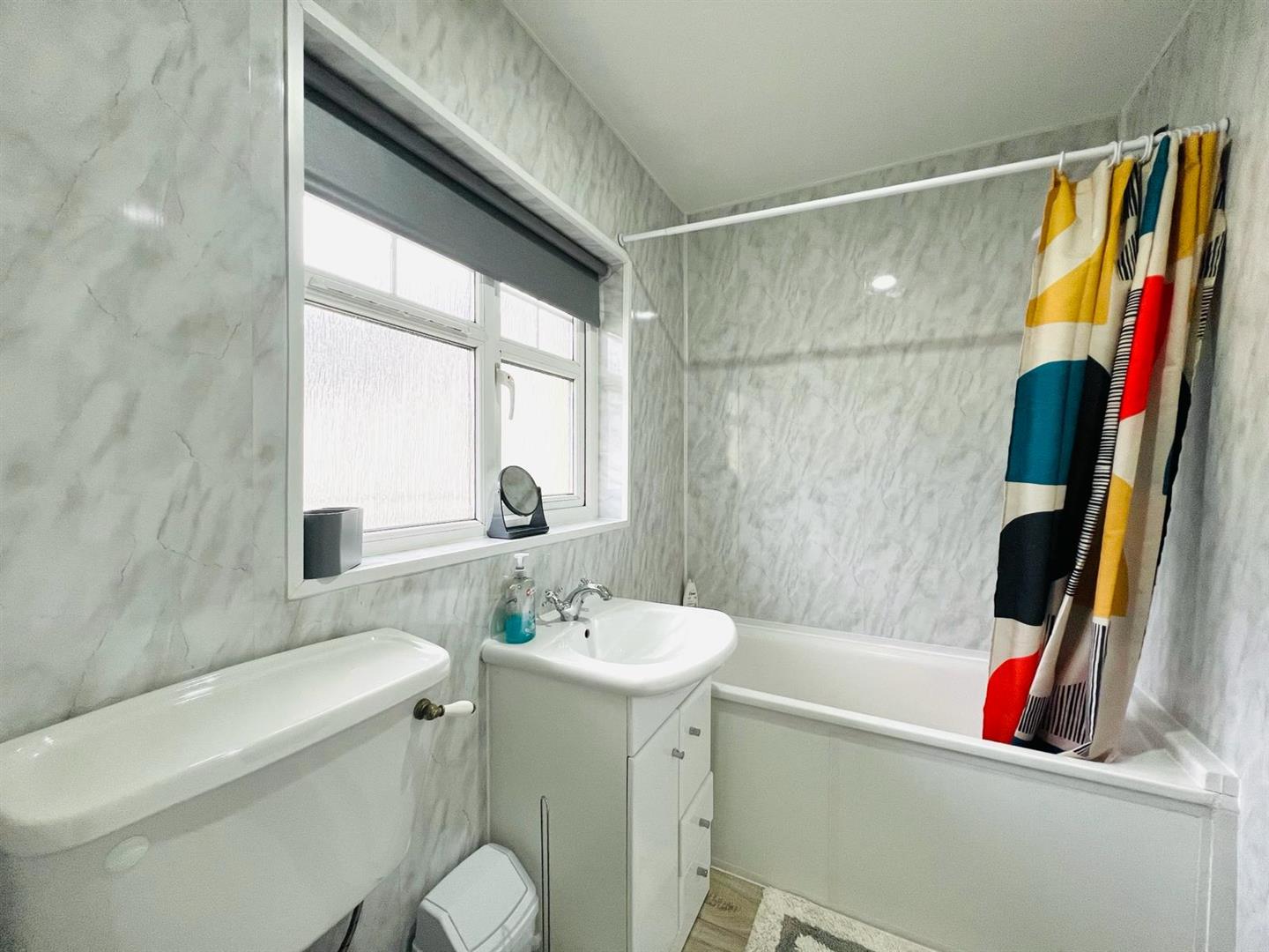 Comprising bath with electric shower over, whb set in vanity unit, wc, PVC cladding to walls, laminated wooden floor.