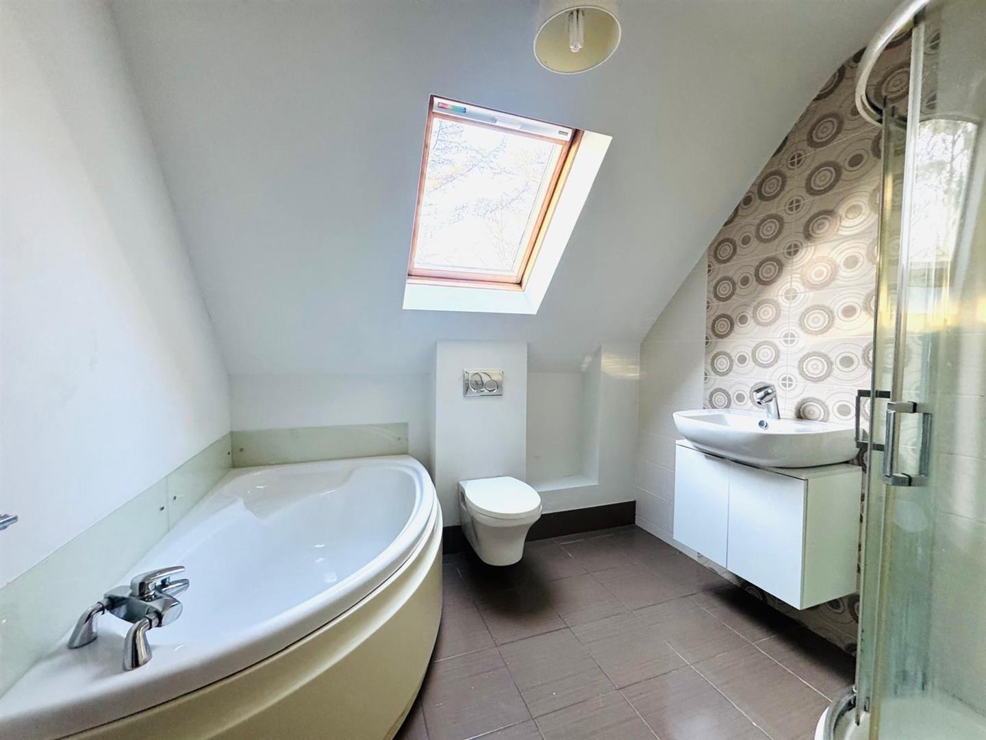 Comprising corner bath with mixer taps, whb with mixer taps set in vanity unit, wc, fully tiled walk in shower, partly tiled walls, tiled floor.