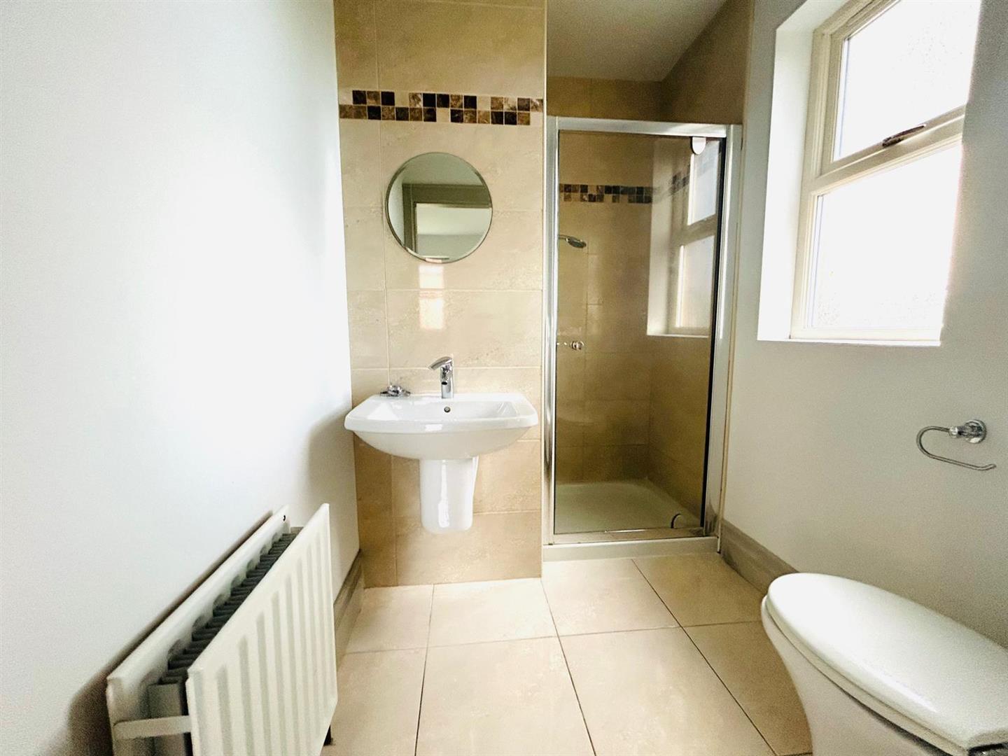 Comprising fully tiled walk in shower, whb with mixer taps and tiling around, wc, extactor fan, tiled floor.