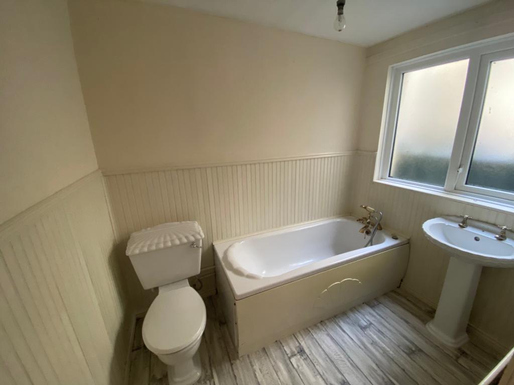 Comprising bath with shower attachment to taps, whb and wc, 1/2 height wooden panelled walls.