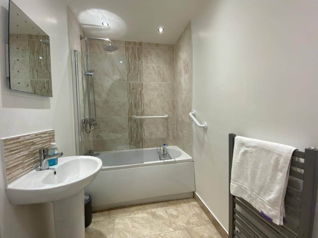 Comprising bath with shower over and tiling around, shower screen, whb and wc, recessed lighting, tiled floor.