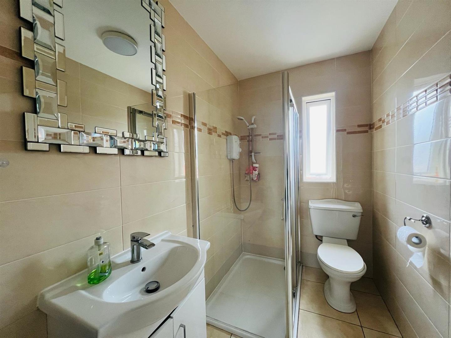 Comprising walk in electric shower, whb set in vanity unit, wc, fully tiled walls and floor.