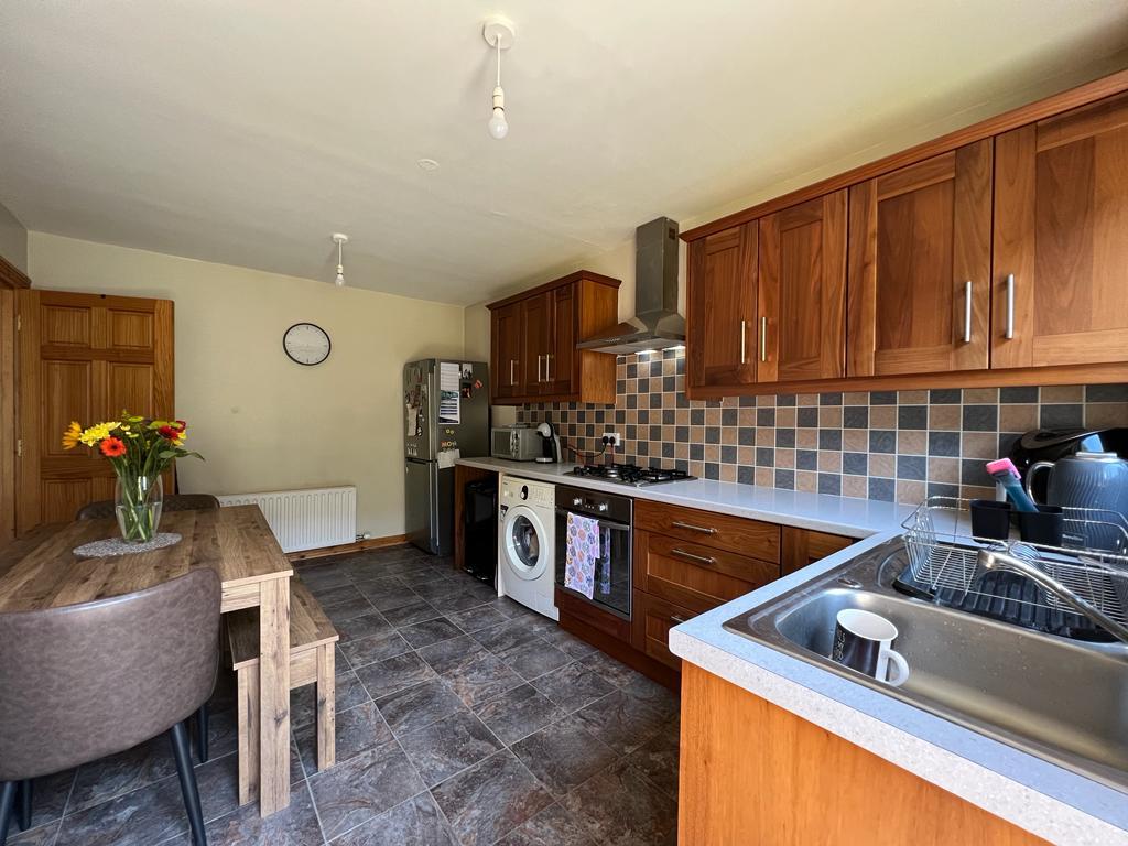4.62m x 3.02m (15'2" x 9'11") - Having eye and low level units, tiling between units, single drainer stainless steel sink unit with mixer taps, gas hob, electric underoven, stainless steel extractor hood, plumbed for washing machine, space for tumble dryer, space for fridge / freezer, dining space, tiled floor.