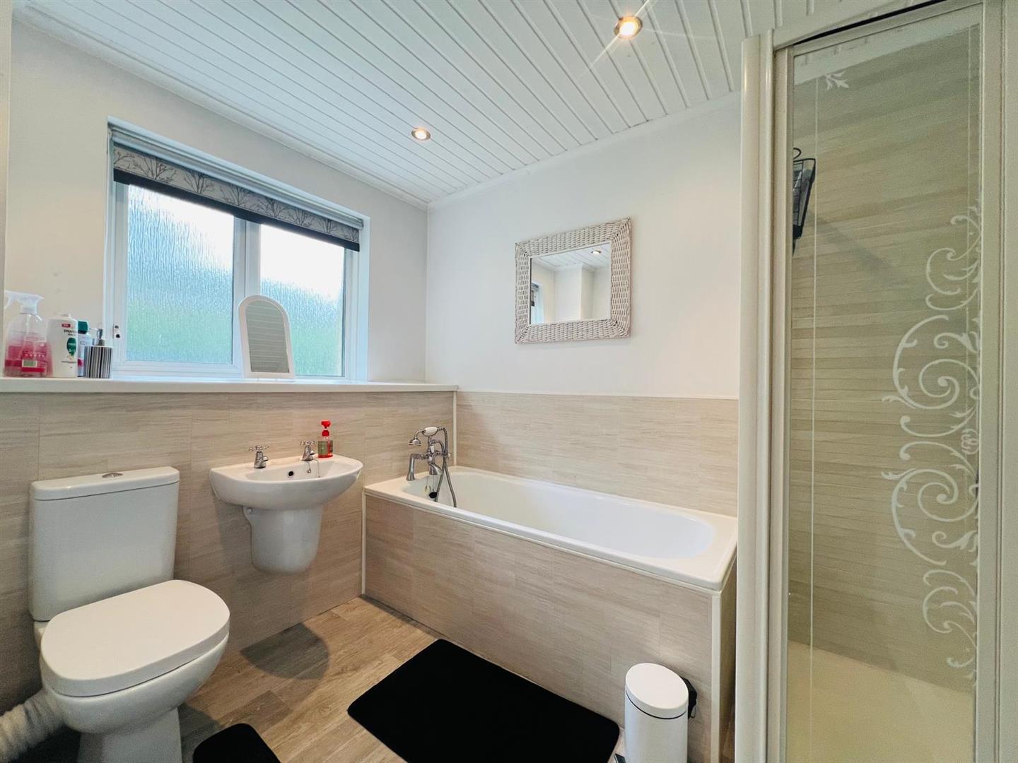 Comprising bath, fully tiled walk in electric shower, whb and wc, recessed lighting.