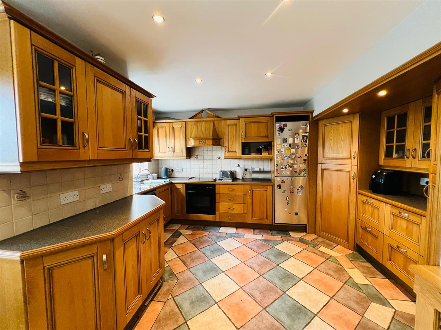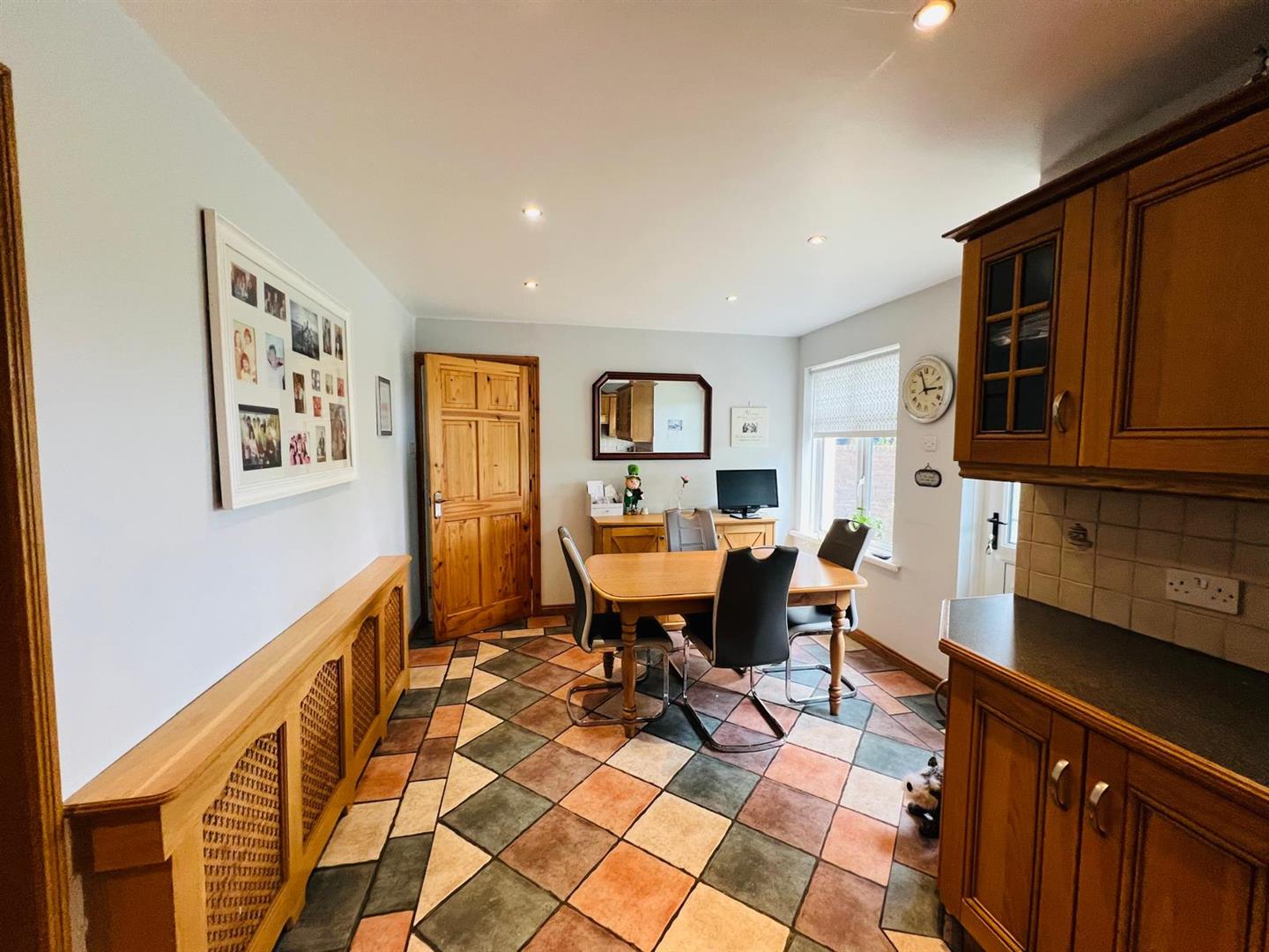 5.84m x 3.20m (19'2" x 10'6") - Having range of eye and low level units, tiling between units, 1 1/2 bowl stainless steel sink unit with mixer taps, hob, underoven, extractor hood, plumbed for washing machine, space for fridge / freezer, ample dining space, recessed lighting, tiled floor.