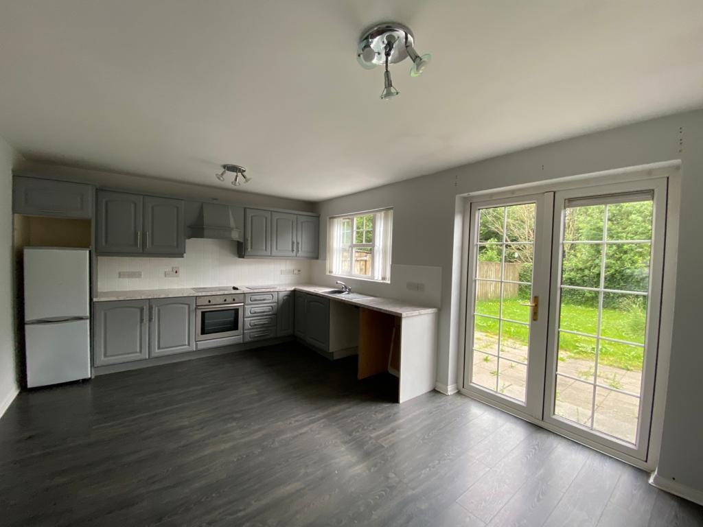 5.18m x 3.58m (17' x 11'9") - Having eye and low level units, tiling between units, integrated hob and underoven, extractor hood, plumbed for washing machine, space for tumble dryer, space for fridge / freezer, laminated wooden floor, French doors leading to patio.