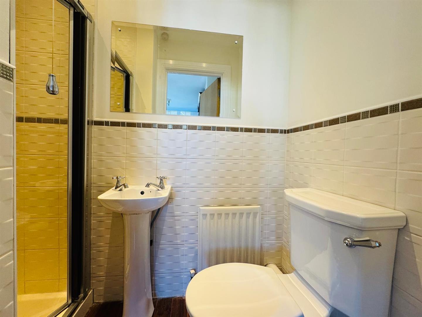 Comprising fully tiled walk in electric shower, whb and wc, extractor fan, recessed lighting, 1/2 tiled walls, wooden floor.
