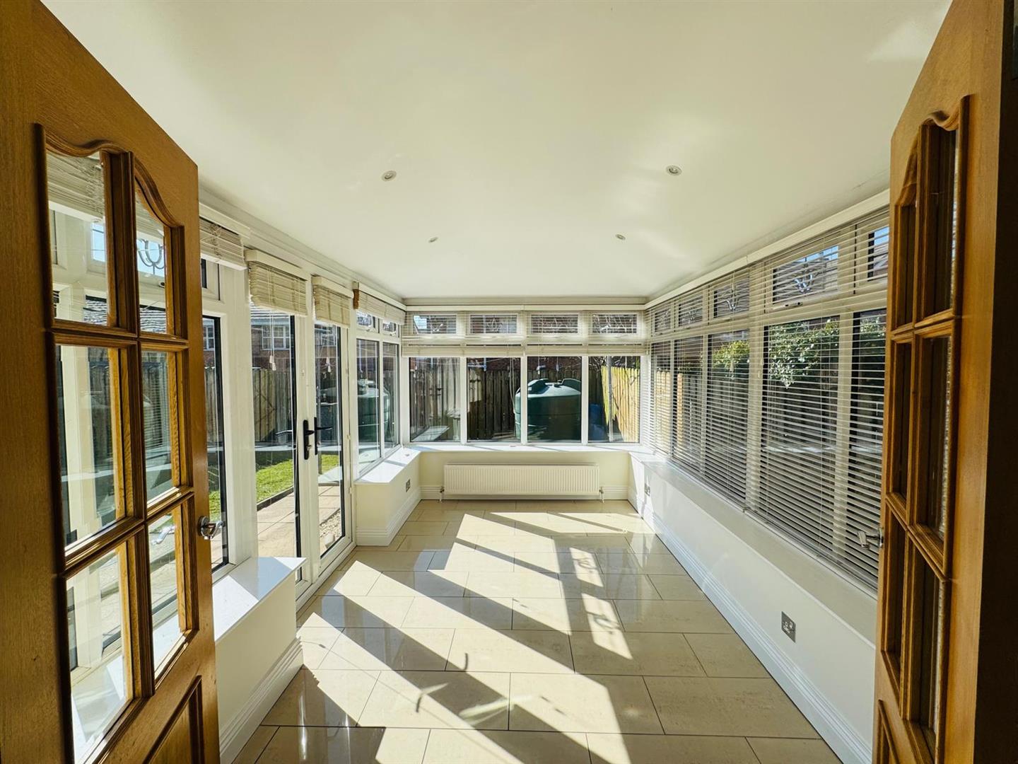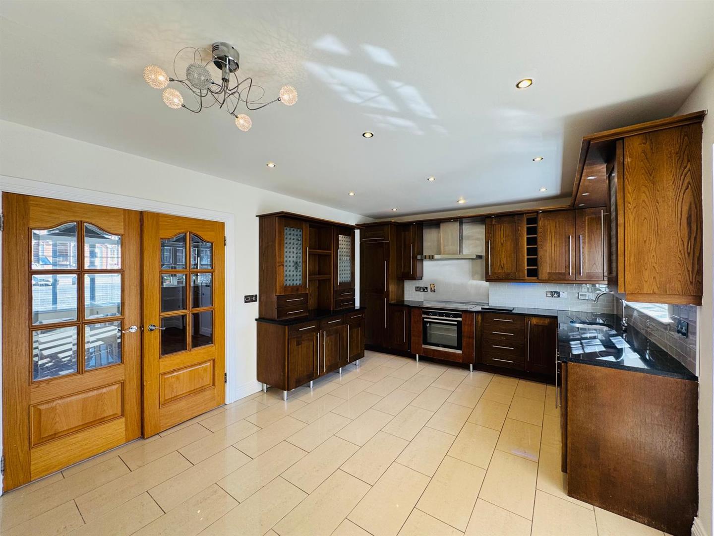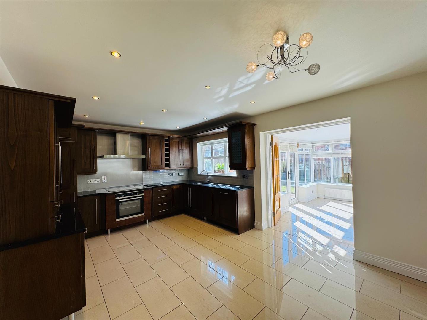 5.28m x 3.56m (17'4" x 11'8") - Having eye and low level units, tiling between units, matching dresser and window pelmet with feature lighting, single drainer stainless steel sink unit with mixer taps set in granite worktop, integrated hob and underoven, stainless steel extractor hood and splashback, integrated fridge / freezer and dishwasher, recessed lighting, ample dining space, tiled floor, double doors to Sun Room.