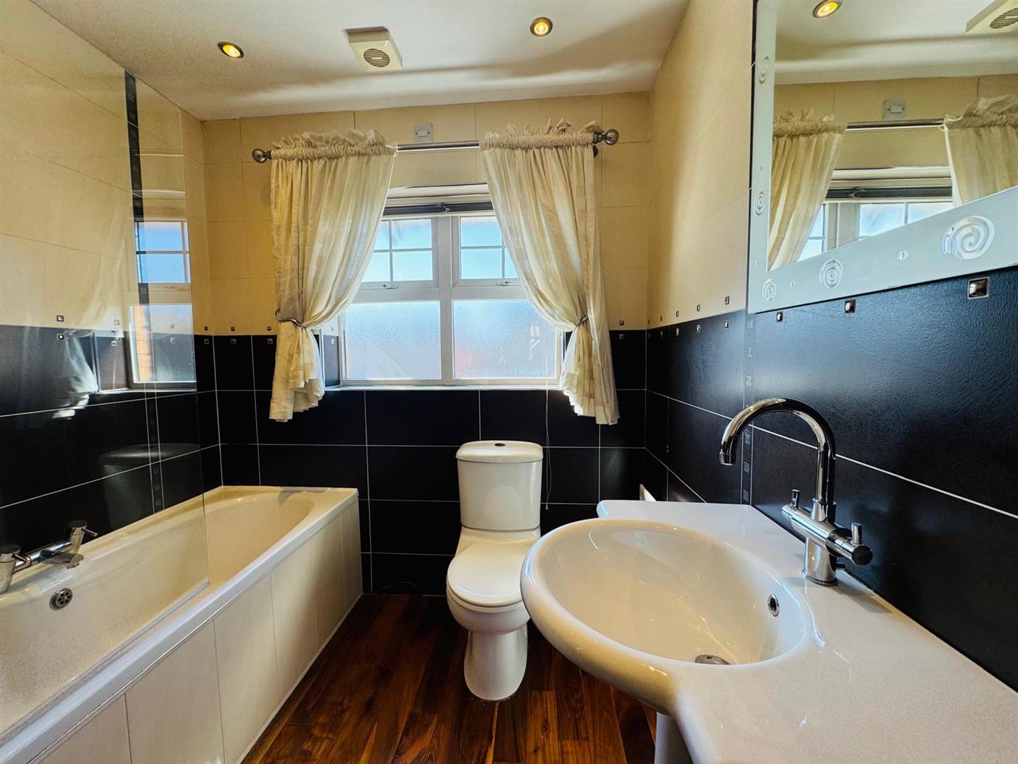 Comprising bath with electric shower over, whb with mixer taps, wc, recessed lighting, fully tiled walls, wooden floor.