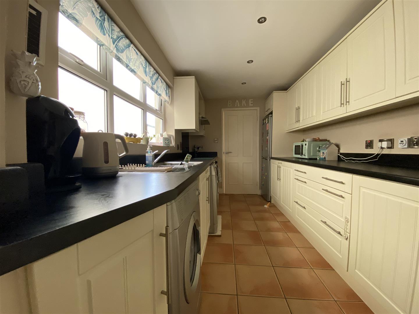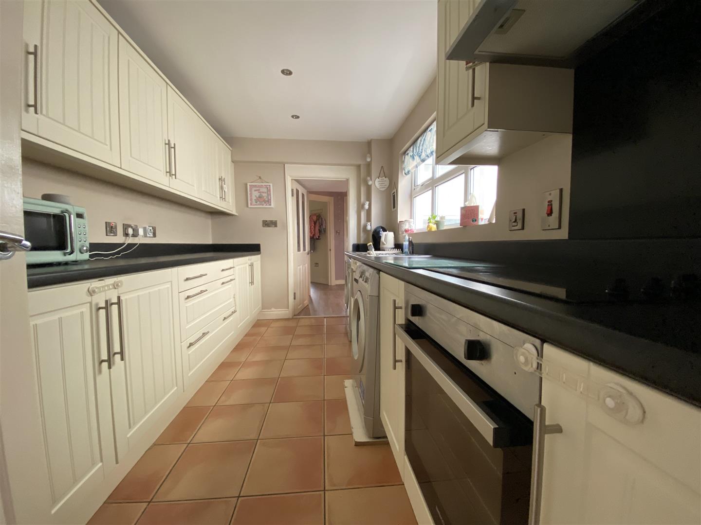 3.89m x 2.24m (12'9" x 7'4") - Having range of eye and low level units, 1 1/2 bowl stainless steel sink unit with mixer taps, hob, underoven, stainless steel extractor hood, plumbed for washing machine, space for tumble dryer, space for fridge / freezer, recessed lighting, tiled floor.