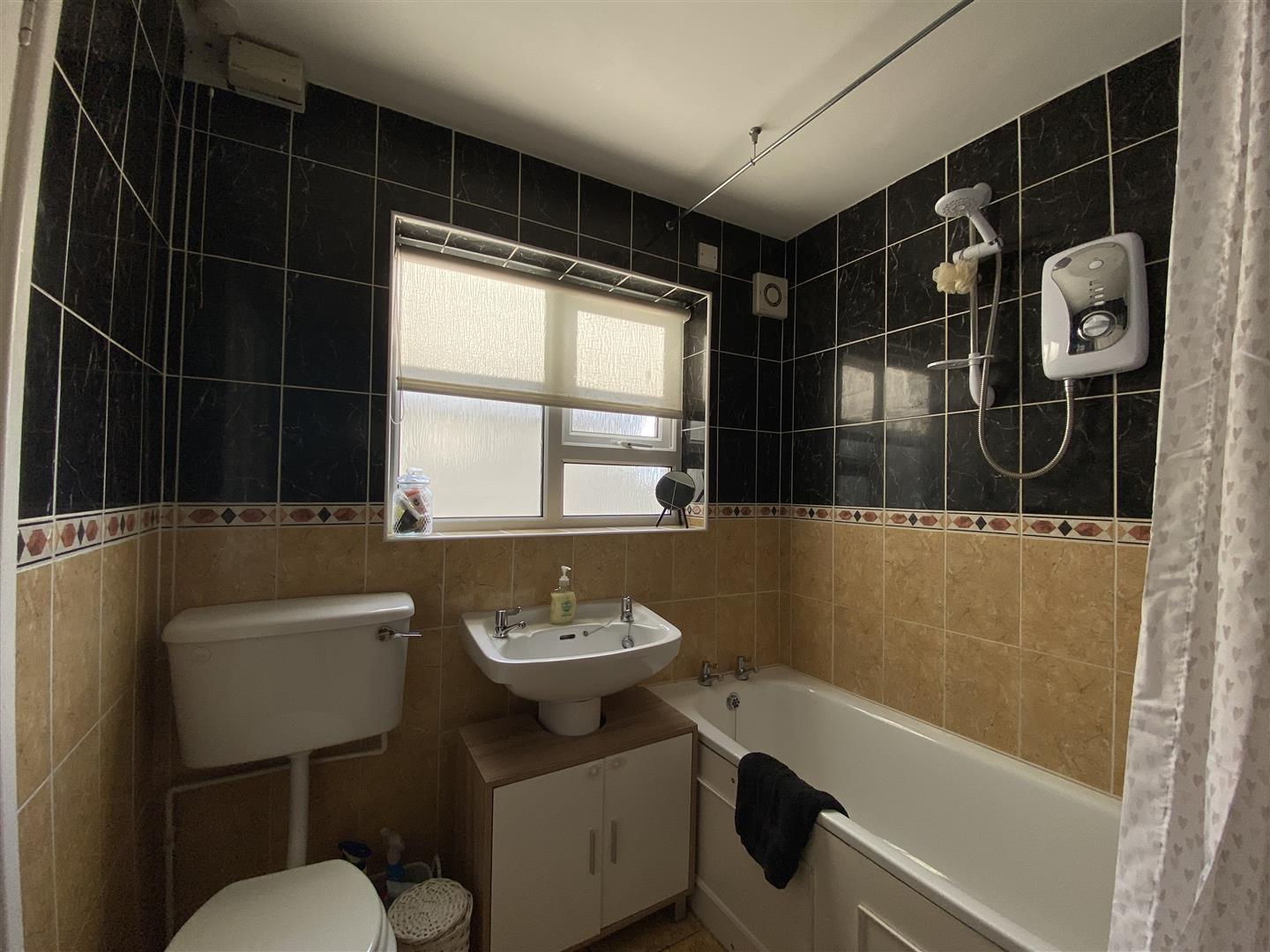 Comprising bath with electric shower over, whb and wc, recessed lighting, fully tiled walls and floor.