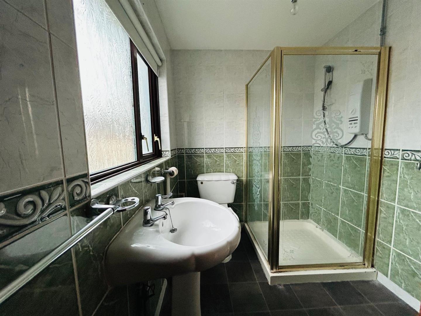 Comprising fully tiled walk in shower, whb and wc, fully tiled walls.