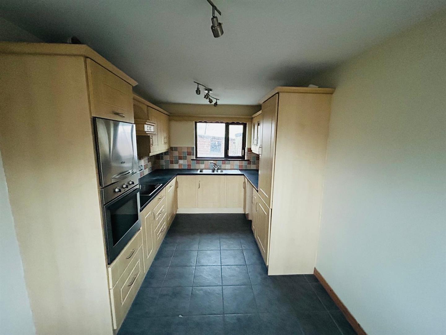 4.60m x 2.57m (15'1" x 8'5") - Having eye and low level units, matching window pelmet, tiling between units, 1 1/2 bowl stainless steel sink unit with mixer taps, integrated gas hob, separate oven, extractor hood, integrated fridge / freezer and dishwasher, plumbed for washing machine, tiled floor.