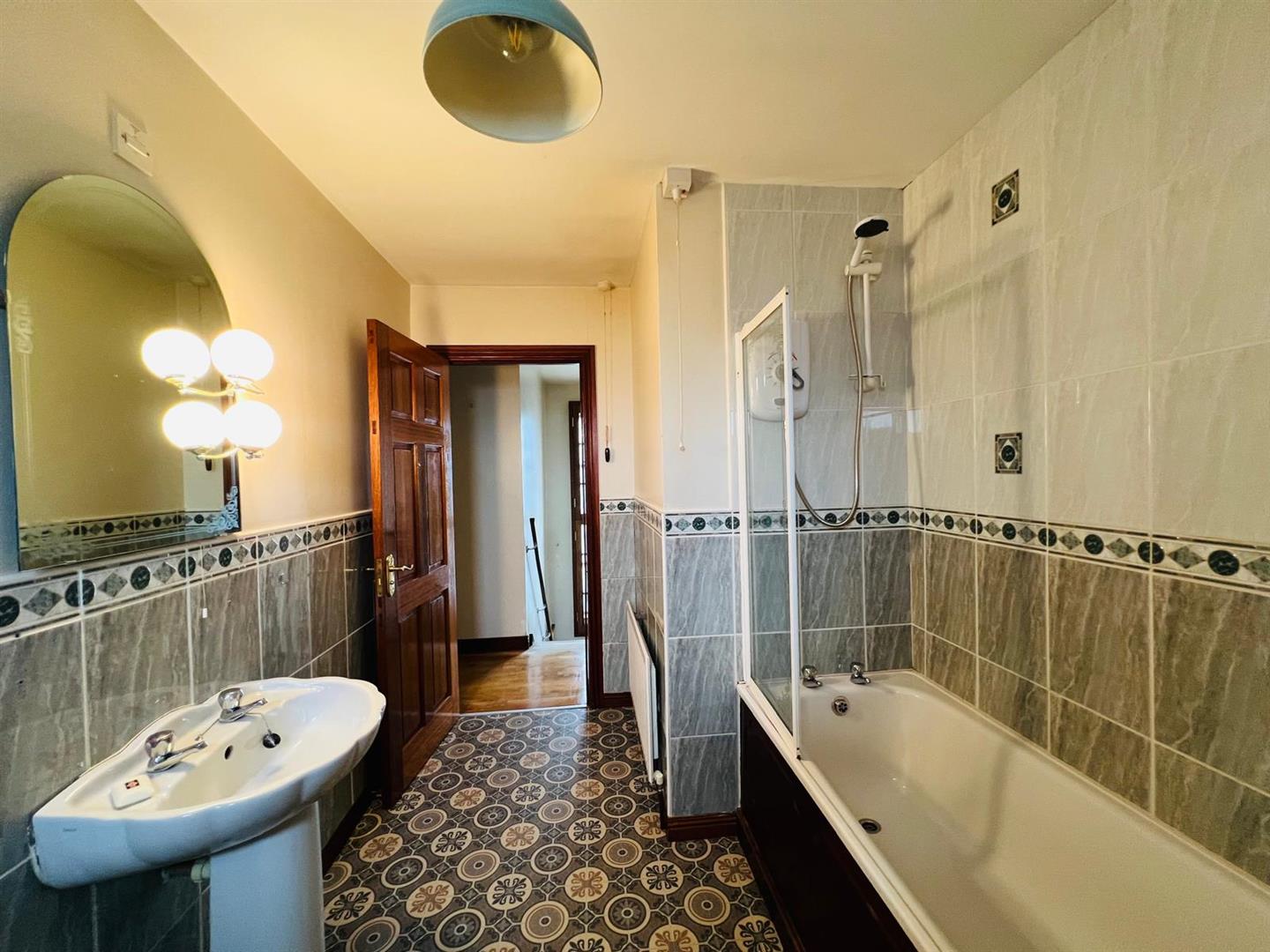 Comprising fully tiled walk in shower, whb and wc, 1/2 tiled walls, wooden floor.