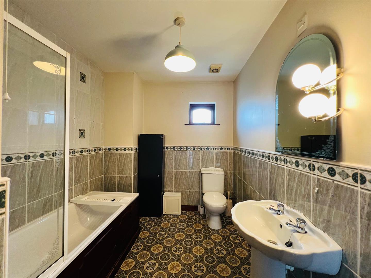 Comprising bath with electric shower over, shower screen, whb and wc, 1/2 tiled walls.