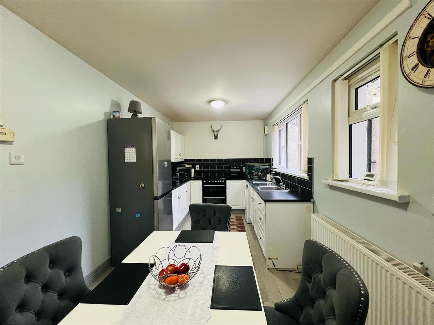5.82m x 2.59m (19'1" x 8'6") - Having eye and low level units, tiling between units, single drainer stainless steel sink unit with mixer taps, wired for cooker, plumbed for washing machine, space for fridge / freezer, dining space, understairs storage, laminated wooden floor.