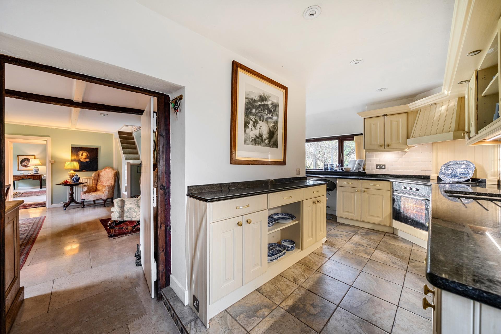 The kitchen is both practical and full of character, fitted with a range of traditional-style units, work surfaces and integrated appliances. With views over the garden and direct access to the dining room, it works as the natural hub of the home while offering scope for future enhancement if desired.