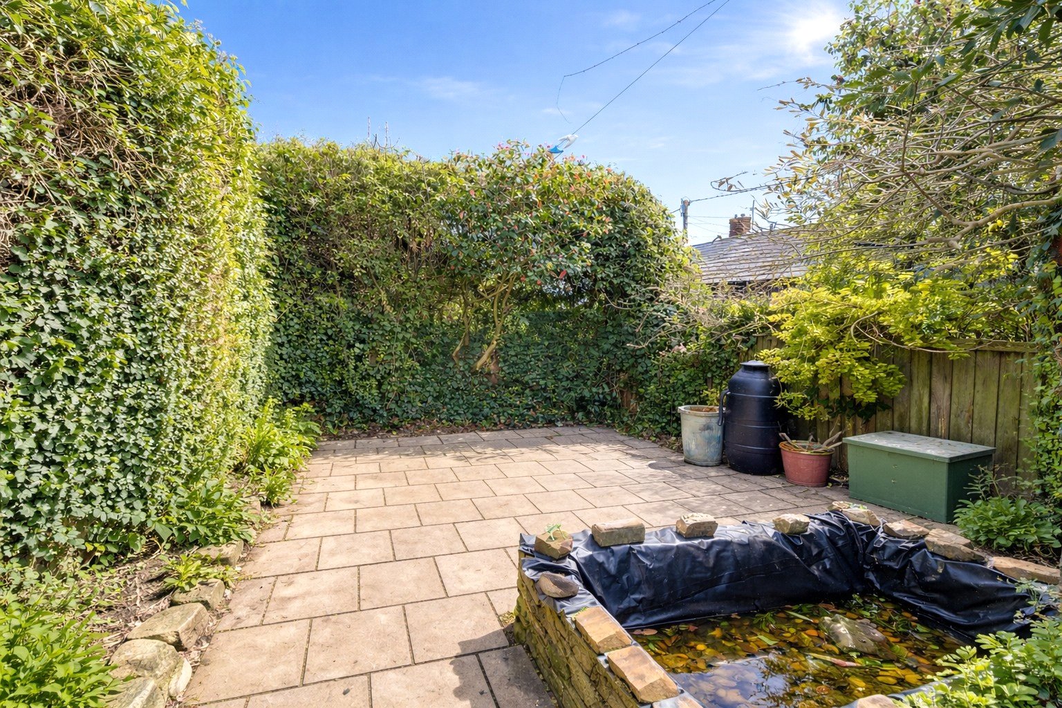 Outside, the rear garden offers patio areas arranged over different levels, a pond, and rear access to two designated parking spaces.