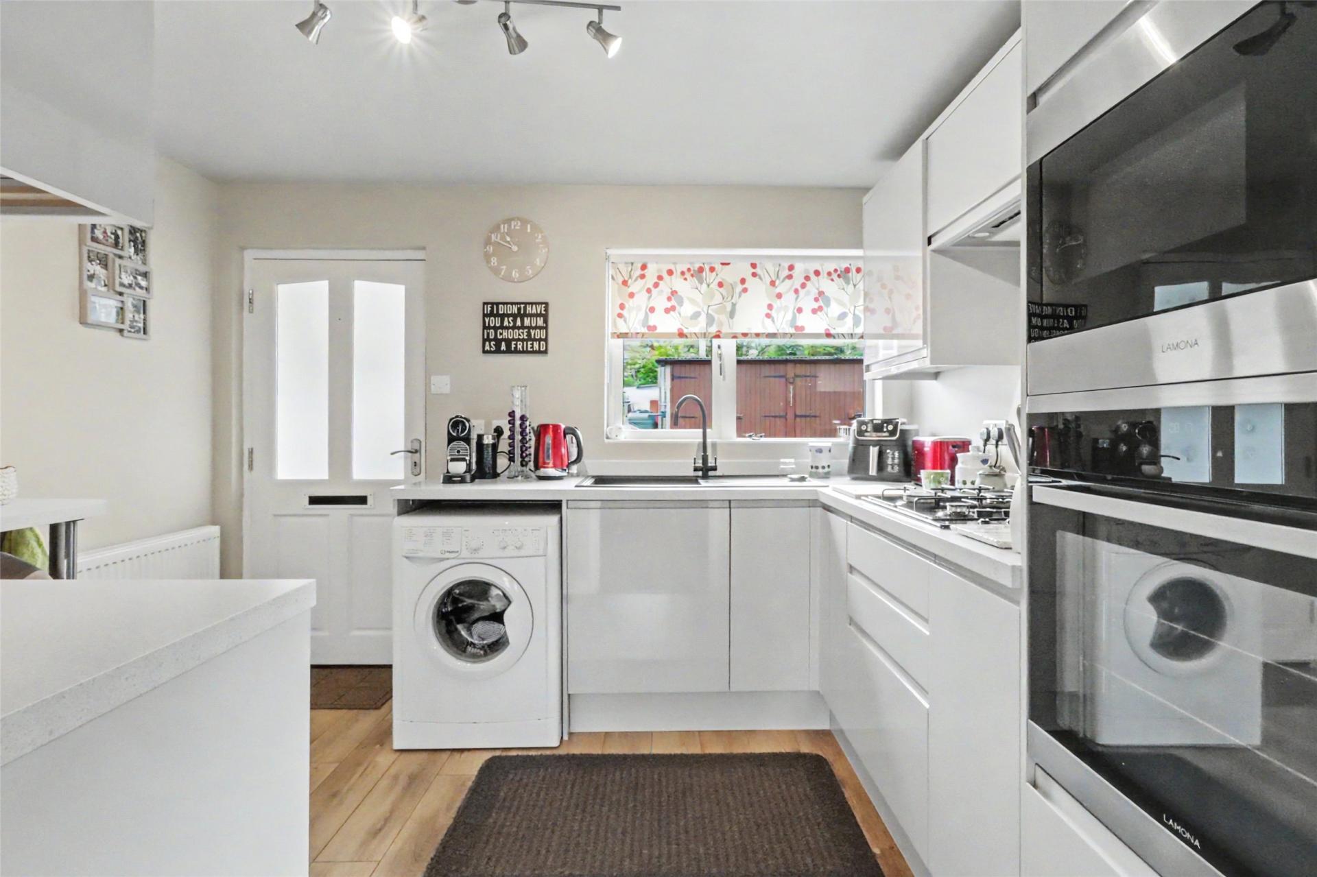 The modern fitted kitchen integrates well within the overall layout, providing a clean and practical space for everyday use. It is equipped with an integrated electric oven, gas hob, and space for a freestanding washing appliance. Beyond the kitchen, a useful porch/utility area offers additional storage and further practicality