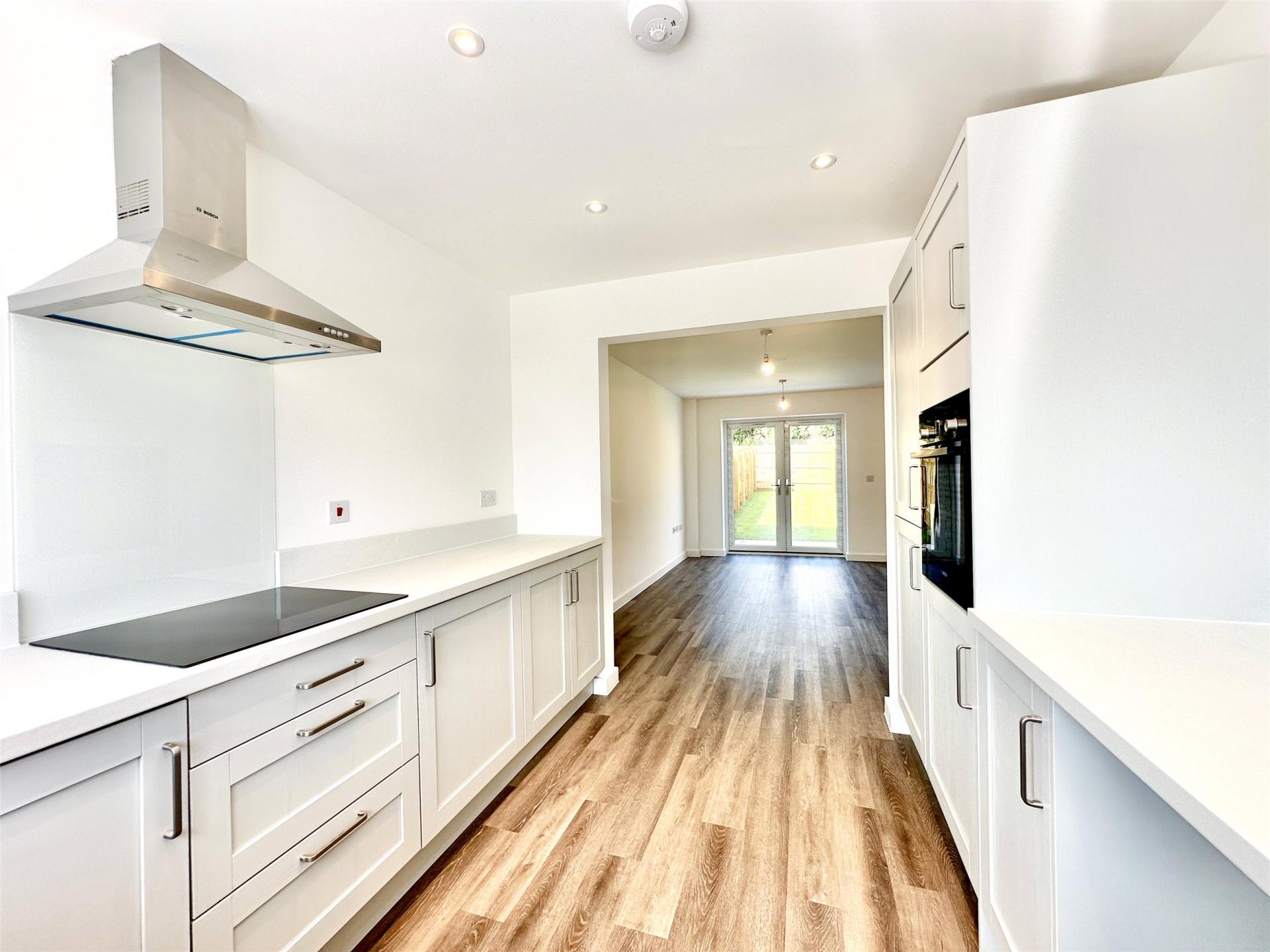 A welcoming hallway leads into the home and has the stairs to the first floor. A door leads through into a generous sized living room which has double doors opening directly onto the sun terrace and south facing garden, ideal for relaxing evenings or summer days outdoors. Opening from the living room is a well-equipped kitchen, complete with modern units and integrated appliances including oven, hob, extractor, fridge/freezer and dishwasher.