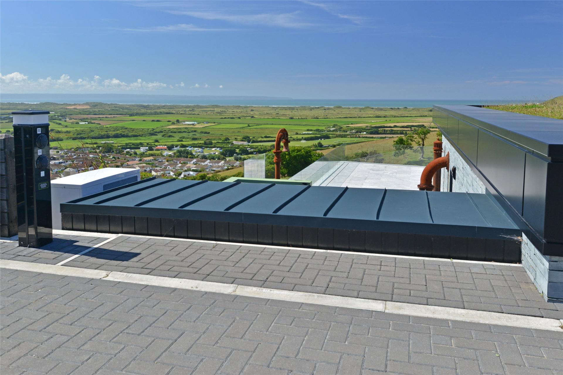 Outside, there is a large enclosed and electrically gated parking area. A side brick-paved pathway gentle slopes down to the rear of the building where this a superb beautifully paved wrap-around sun terrace with a frameless glazed balustrade that ensures there is no obstruction to the breath-taking and far reaching panoramic views over the neighbouring villages, countryside, the Burrows and out over to the Estuary and the rugged coastline and Bristol Channel. There is more than ample space for plenty of outdoor furniture and the terrace provides a fabulous setting for al-fresco dining, barbecues, sun bathing and provisions laid on for siting a hot tub if required. There is a Wi-Fi controlled outdoor shower, perfect for cleaning off after a long day on the beach. Furthermore there is an enclosed bin store area and further handy store sheds, ideal for bikes, outdoor equipment and utility space.