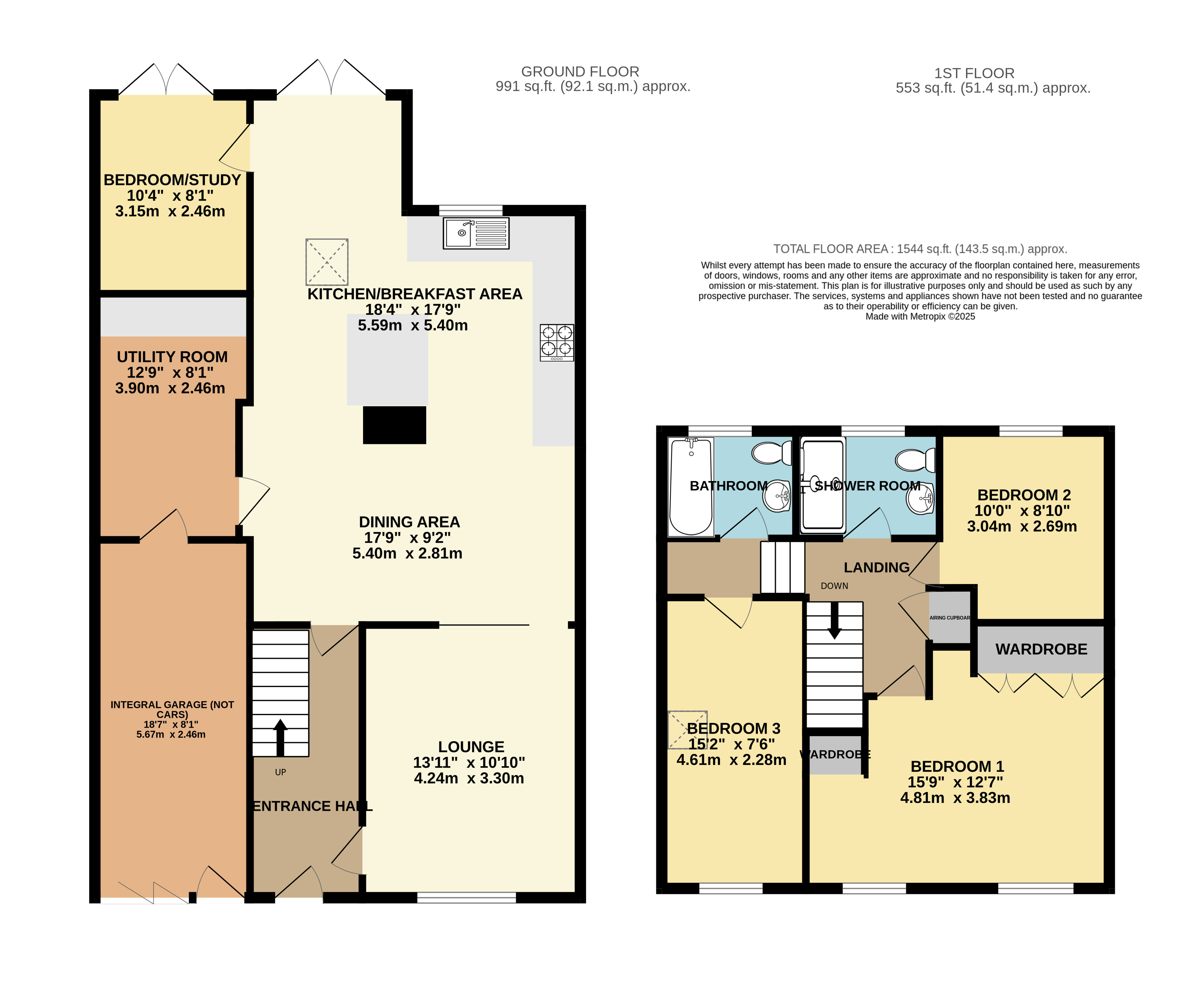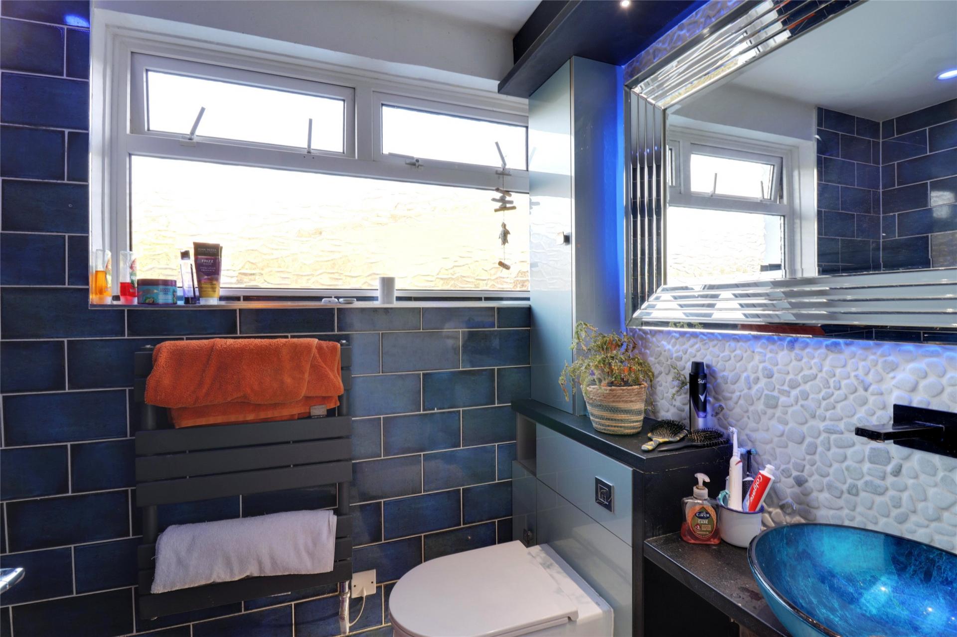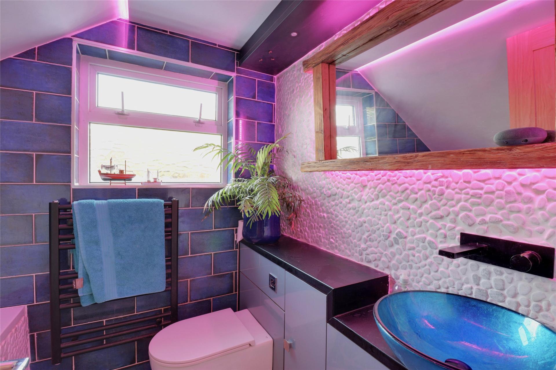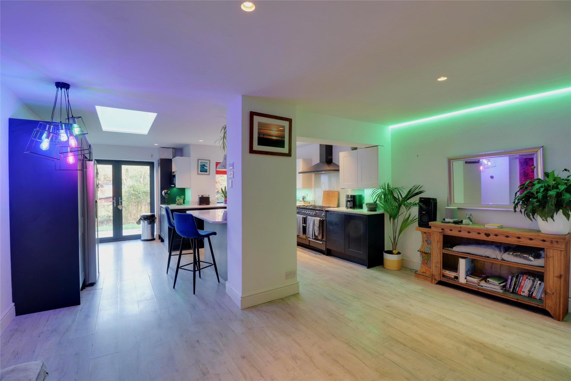 The property has been thoughtfully modernised and extended by the current owners to create a striking open-plan kitchen and breakfast room, complete with customisable lighting options, including colour and brightness settings. This space flows seamlessly into the dining area and through large sliding doors into a cosy lounge, which can also be accessed from the hallway. The ground floor further benefits from a fourth bedroom or study, a utility room accessed via steps, and an integral door leading into a large garage, which is not suitable for car parking.