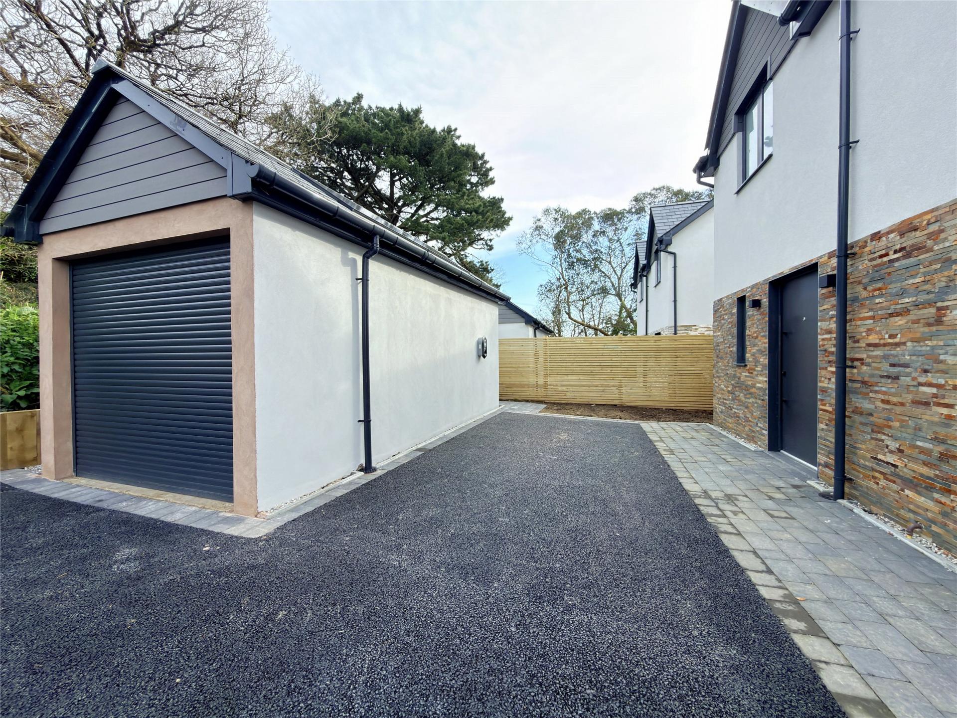 Outside, each home benefits from a driveway with parking for two to three cars and a detached garage fitted with solar panels. The gardens are designed for easy maintenance, with a raised terrace for outdoor dining and a level lawn. Every home is offered with an eight-year build guarantee.