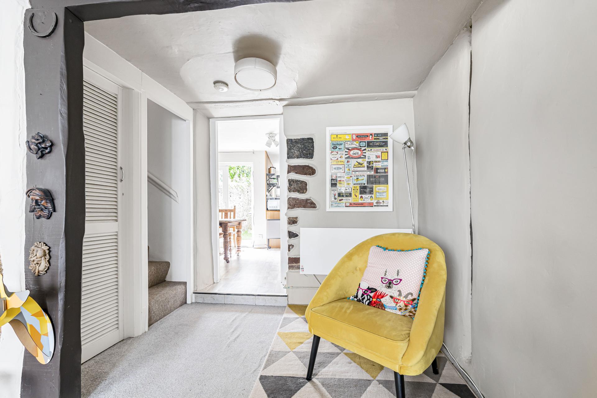 A useful coat cupboard sits just inside the entrance, and additional storage is available beneath the stairs.