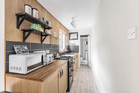 The adjoining galley kitchen is fitted with a range of storage units, stylish tiled splashbacks and solid wood butcher's block-style work surfaces incorporating a stainless-steel sink. There is space for a freestanding dual fuel cooker.
