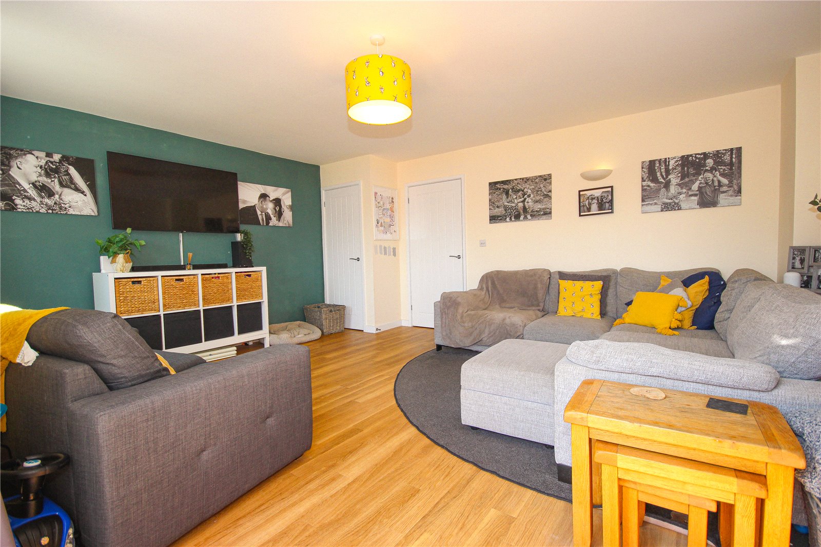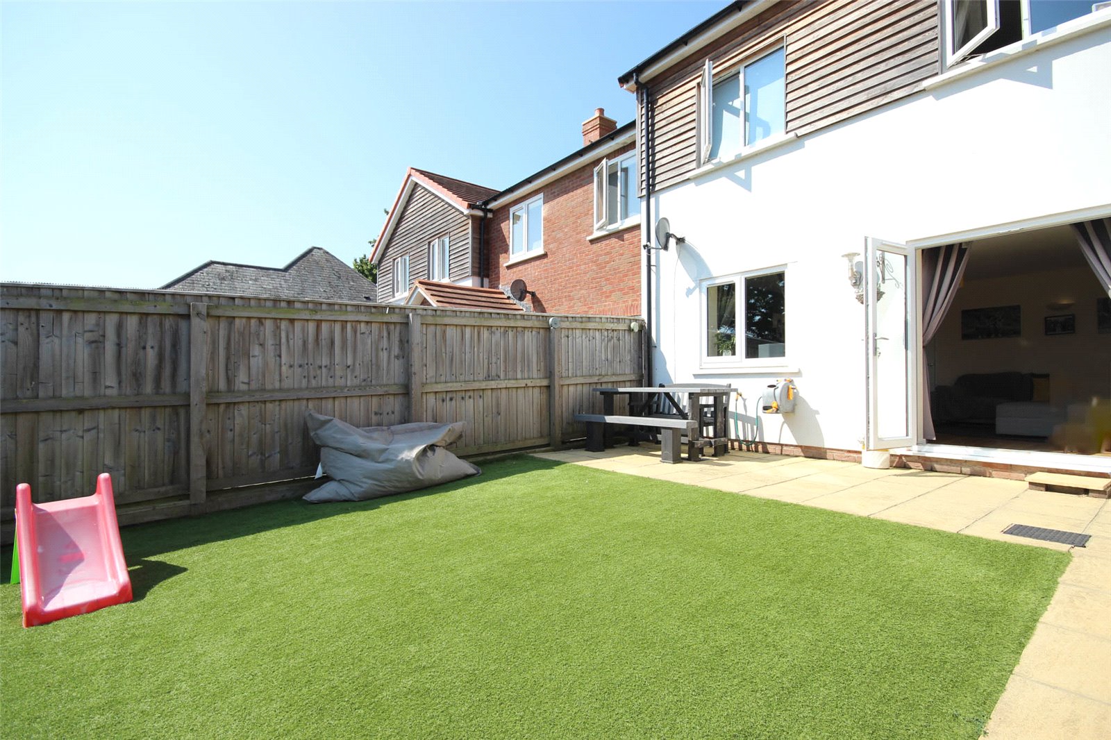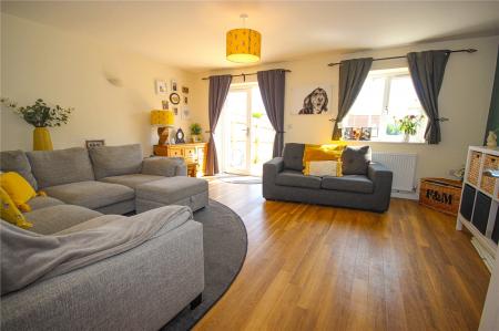 There is a window to the front and ample space for table and chairs at one end of the kitchen. A further door from the entrance hall opens to a good-sized living room at the rear of the property, with French doors and window which opens to the rear garden and gives lovely views to the open fields and countryside in the distance. There is also a useful and sizeable under stairs storage cupboard with shelving and light.