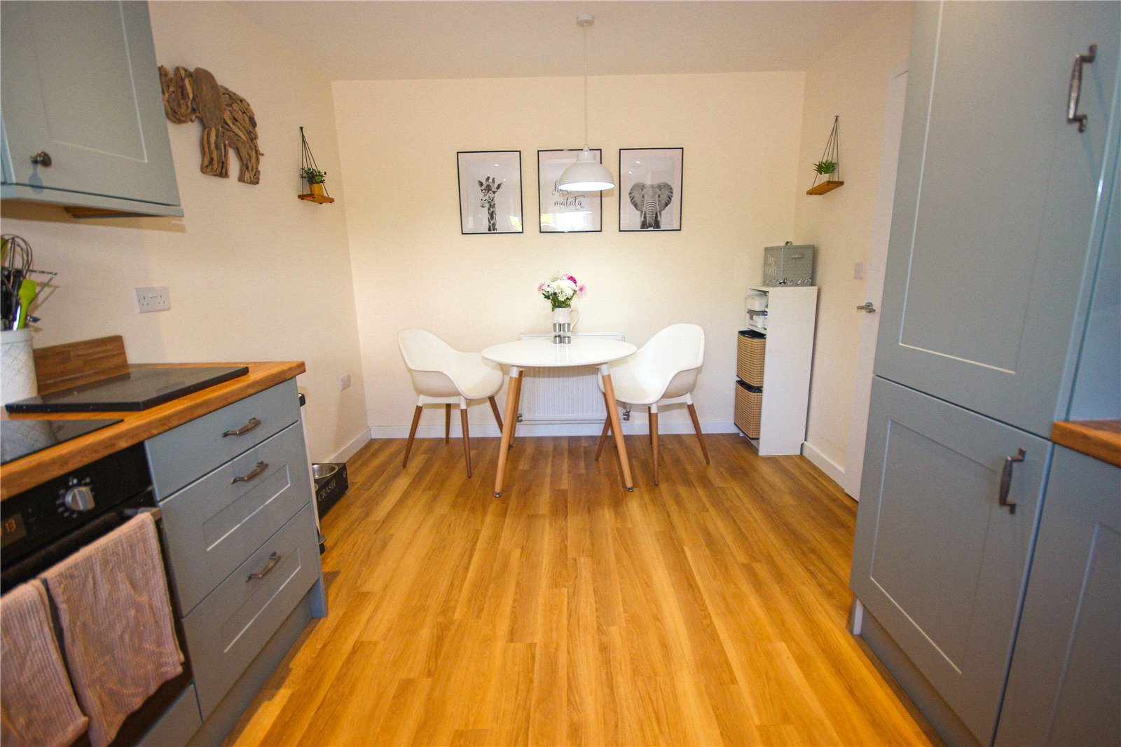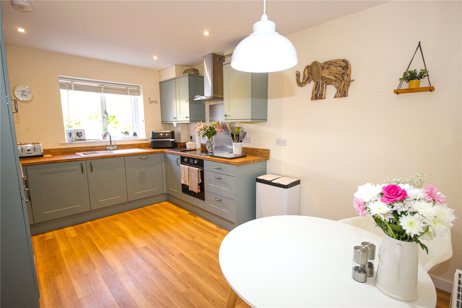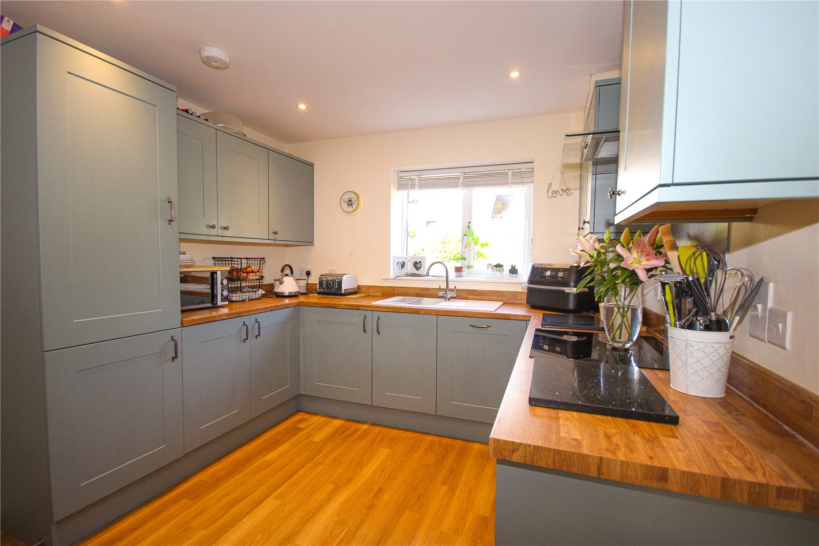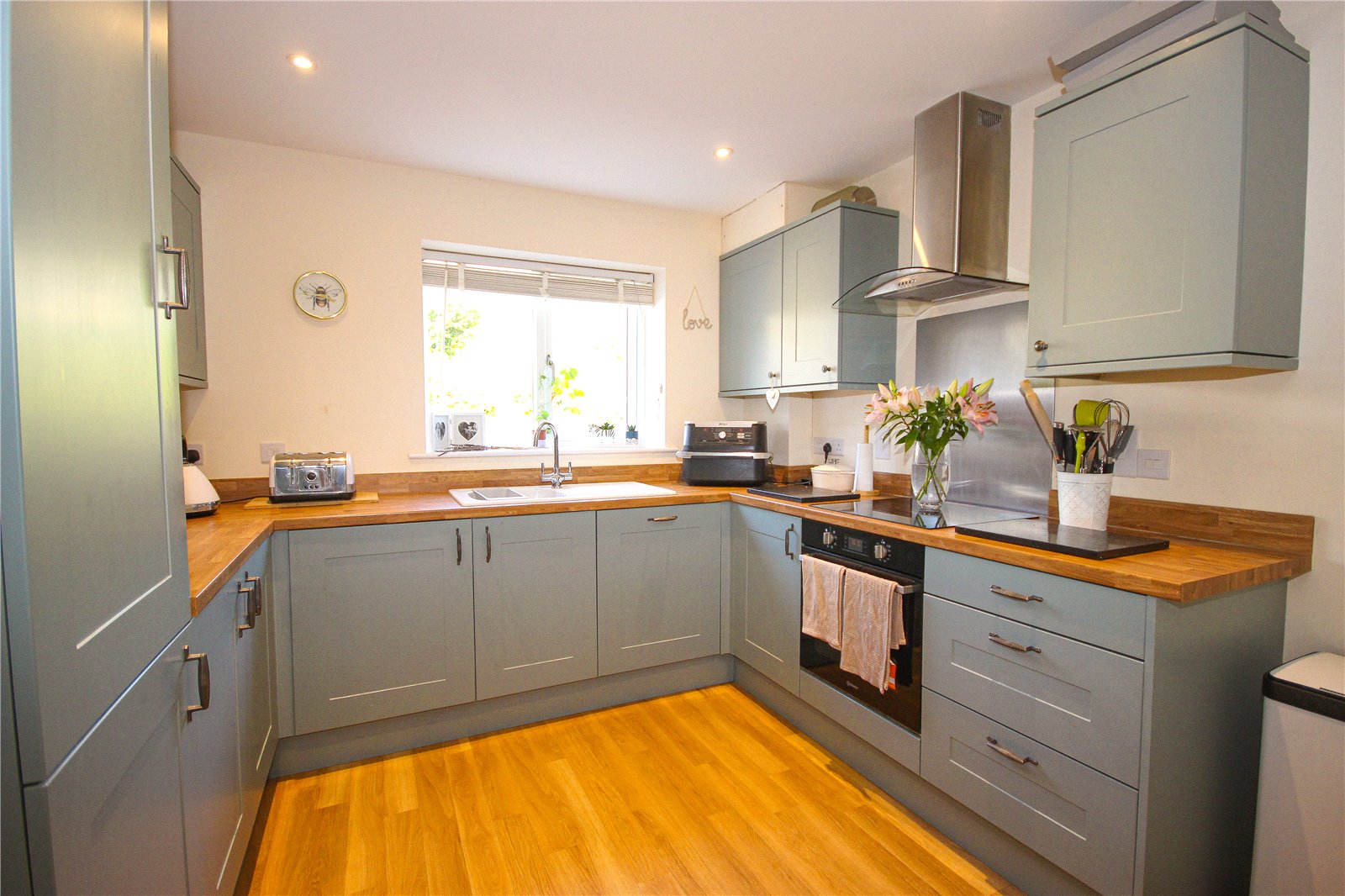 There is an external light to the front door which opens to a good-sized entrance porch with wood effect Karndean luxury vinyl flooring, which then continues to flow through the whole of the ground floor. An inner door from the porch opens to the entrance hall with door off to the right to the downstairs WC with wash basin. A door to the left leads into the comprehensively fitted kitchen/dining room which has a matching range of blue coloured base and wall units with wood effect worktops and upstands, built-in oven with hob and extractor over. In addition, there is a ceramic sink and integrated appliances, including a full-size fridge freezer, washing machine, dishwasher and a cupboard housing the Worcester Combi gas central heating boiler.