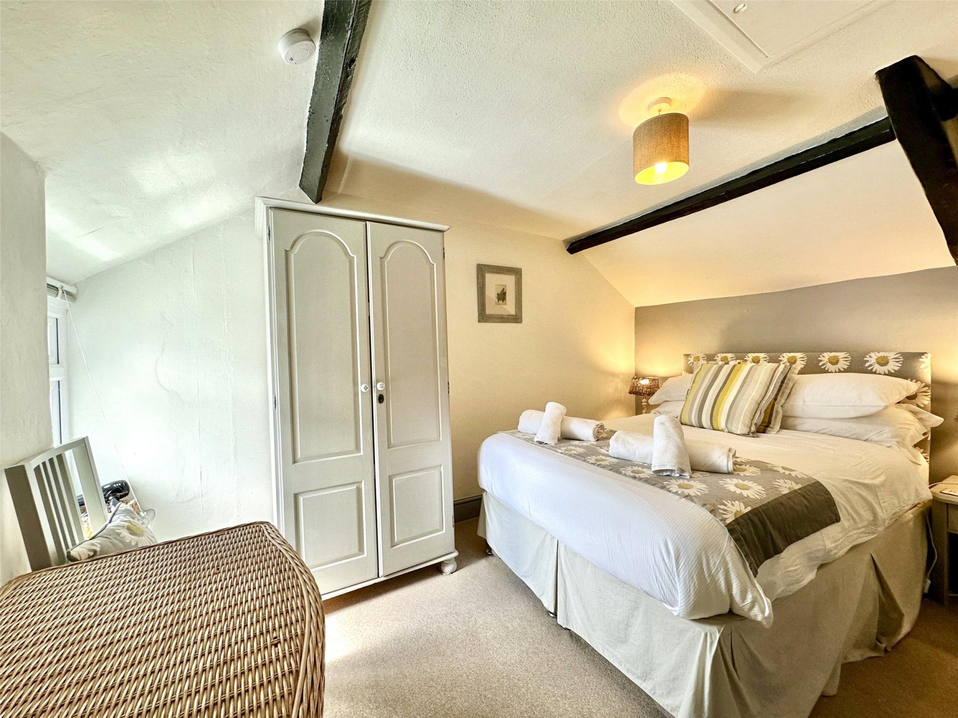 Each room has its own individual character. The main bedroom is particularly attractive with its exposed stone features, an ornamental fireplace, and leaded light windows across the corner of the room. Bedroom two currently houses a double and single bed, while bedroom three offers a snug but spacious retreat. The shower room is modern with a walk-in remote-controlled shower, a toilet, a hand basin, and attractive tiling. The separate bathroom has a more traditional feel with panelled walls and a shower and folding screen over the bath.