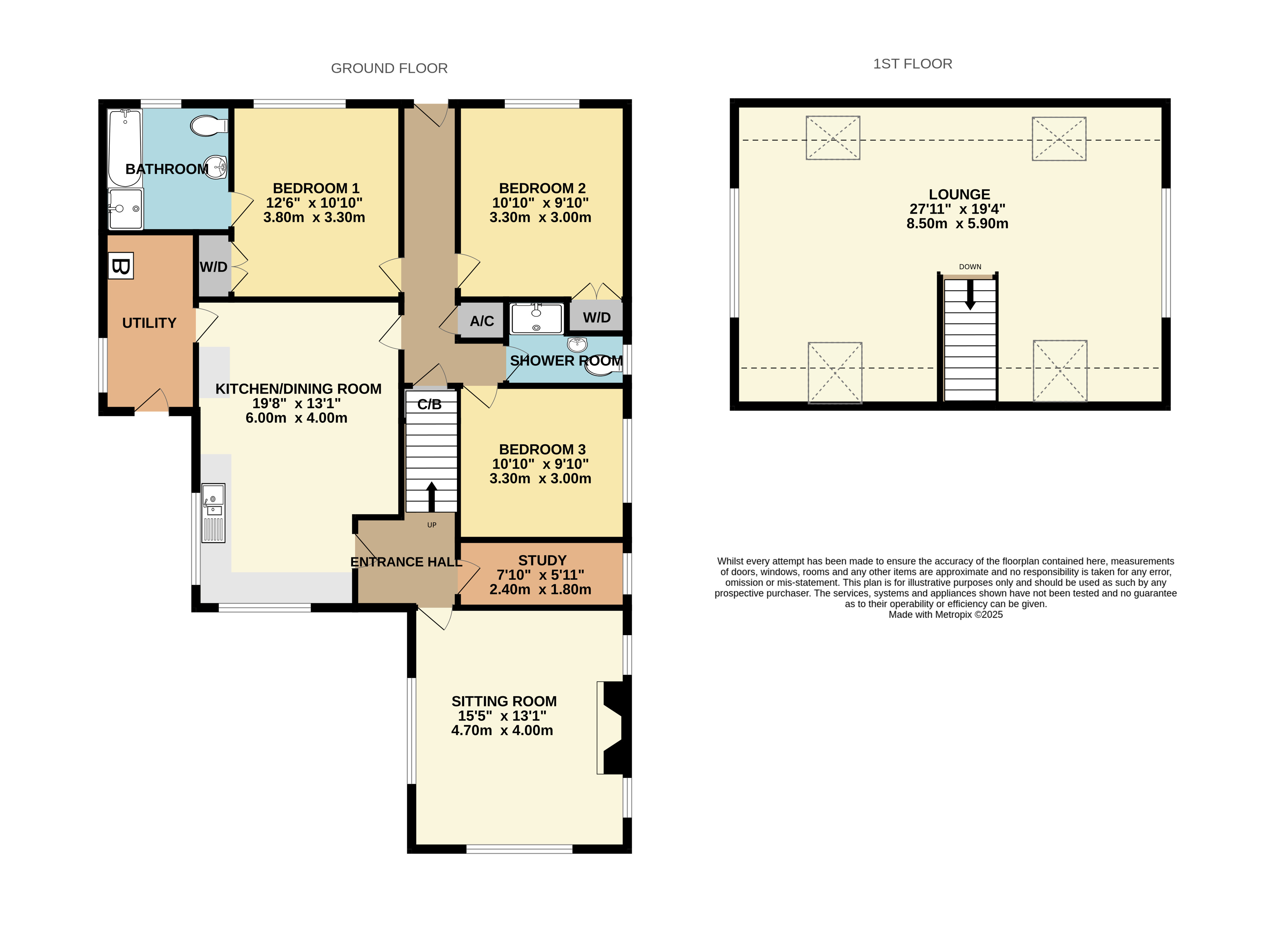 On the ground floor, there are three bedrooms and two bathrooms. The first floor includes a versatile converted loft space, currently used as an entertainment/hobbies area.